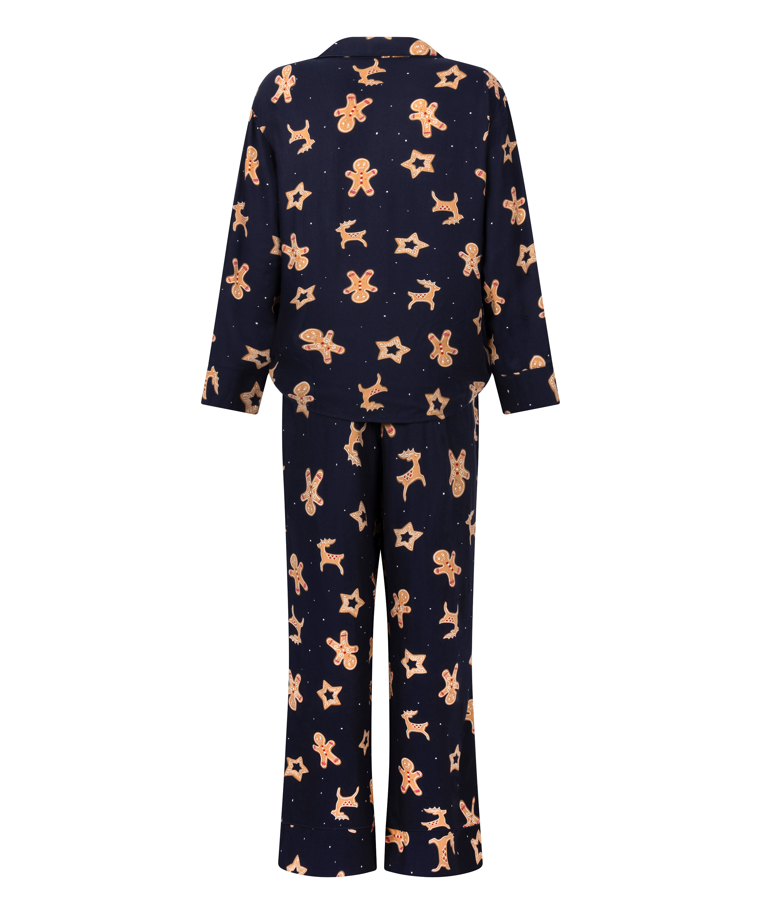 Sov sødt, i peberkagestil. Dette festlige pyjamassæt i twill vil være din favorit til hyggeaftener og sød julestemning med et legende peberkageprint, der næsten er for sødt at sove i. Den langærmede top med V-hals og bukserne med brede ben og elastik i taljen er skabt til afslapning i komfort og stil.