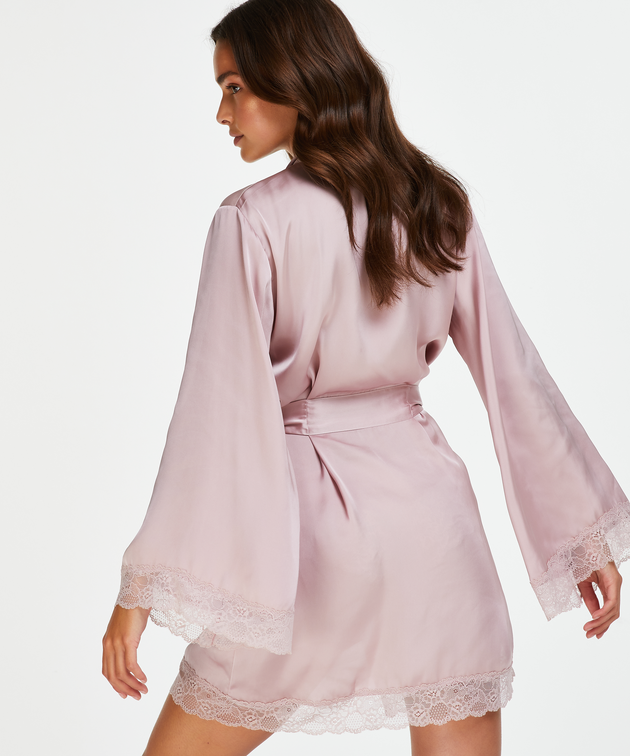 Føl dig sexet i denne fantastiske kimono! Kimonoen har satin look-and-feel og er forsynet med blonder. Denne kimono er perfekt til kvinder, der er mindre end 1,60 m. Kombinér med et smukt lingerisæt fra kollektionen!