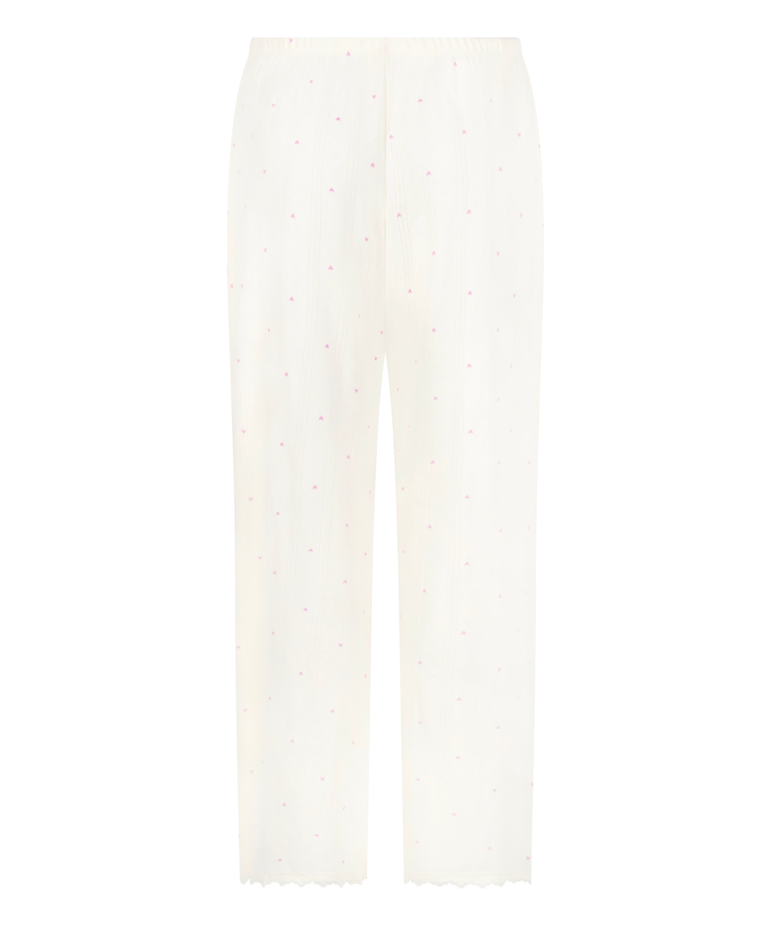 Elsker du komfort med et girly twist? Disse pointelle bukser med vide ben bliver dine nye yndlingsbukser. Med en blød elastisk linning og et diskret hjertemønster er de perfekte til afslappede aftener eller rolige weekender. Den flagrende pasform tilføjer et strejf af elegance til dit udvalg af loungewear. Kombiner med den matchende top eller cami for et helt igennem sødt øjeblik!