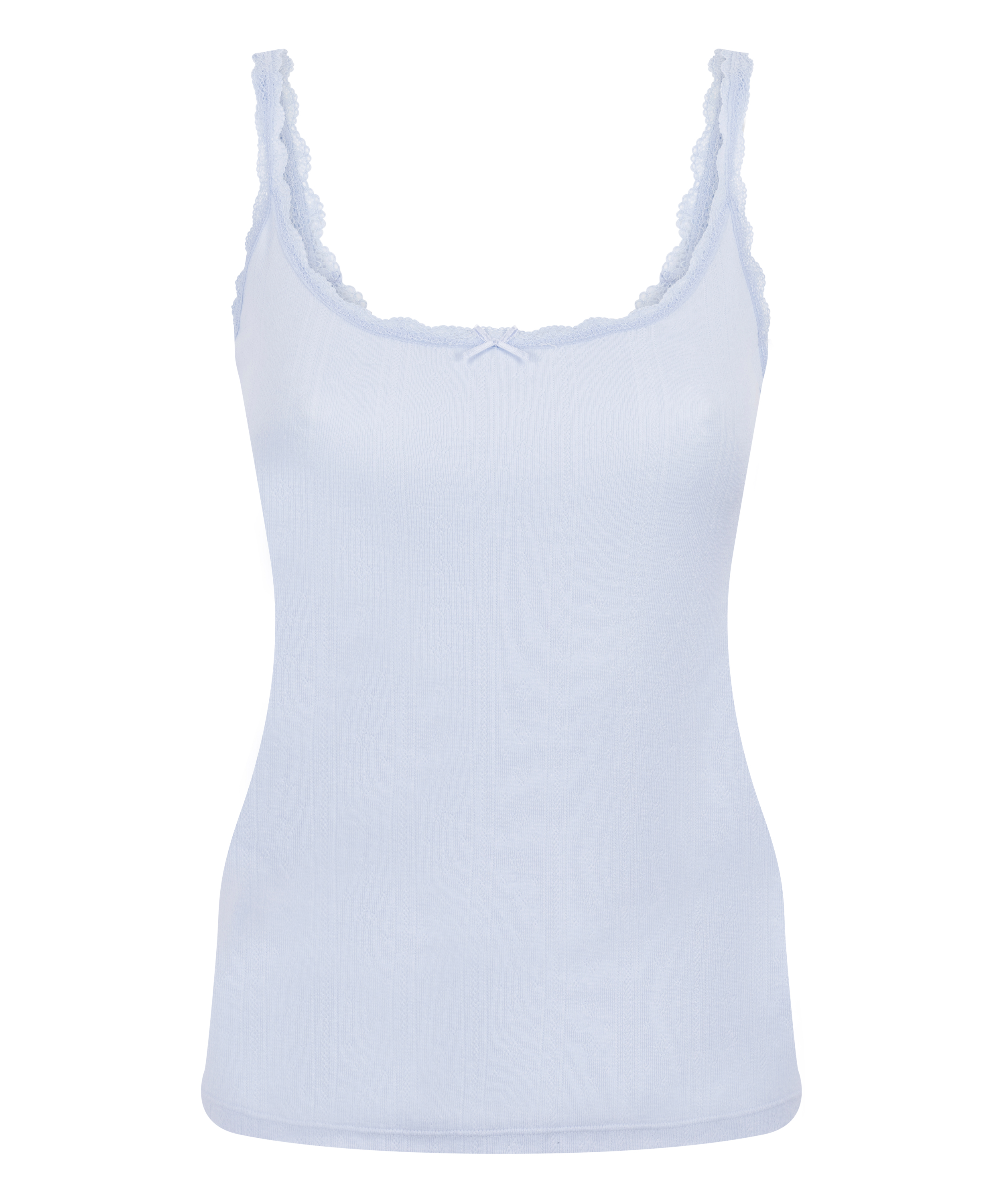 Omfavn ubesværet charme med vores undertrøje, den perfekte blanding af komfort og feminin stil.. Denne undertrøje er fremstillet af blødt pointellestof og har et delikat mønster med tekstur, der giver subtil elegance. Blondedetaljerne langs halsudskæringen giver et romantisk touch,