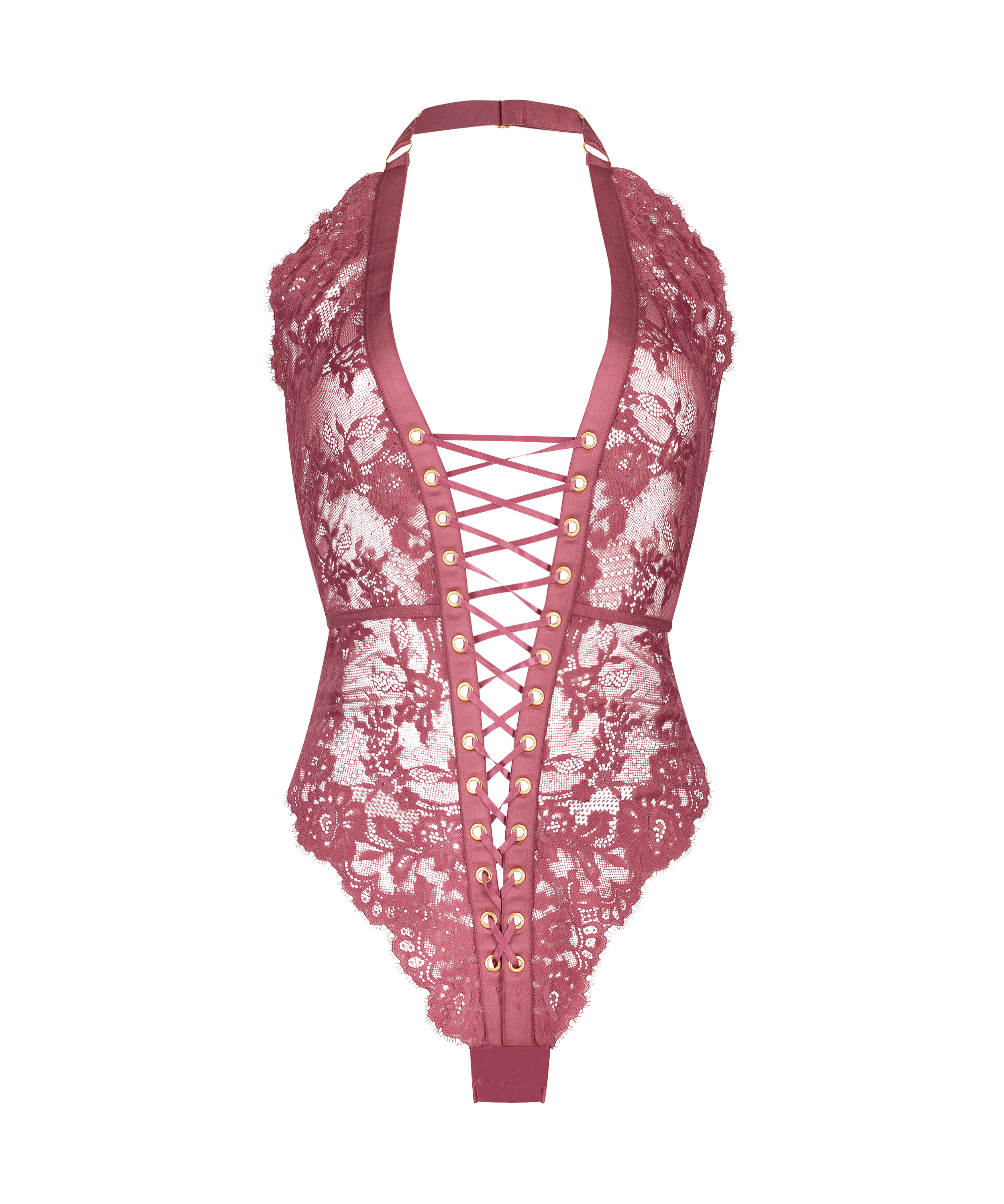 Bliv helt uimodståelig i denne body! Den har en meget dyb V-udskæring med stropper på tværs. Hele bodyen består af blonder. Denne body er del af vores Private-kollektion!