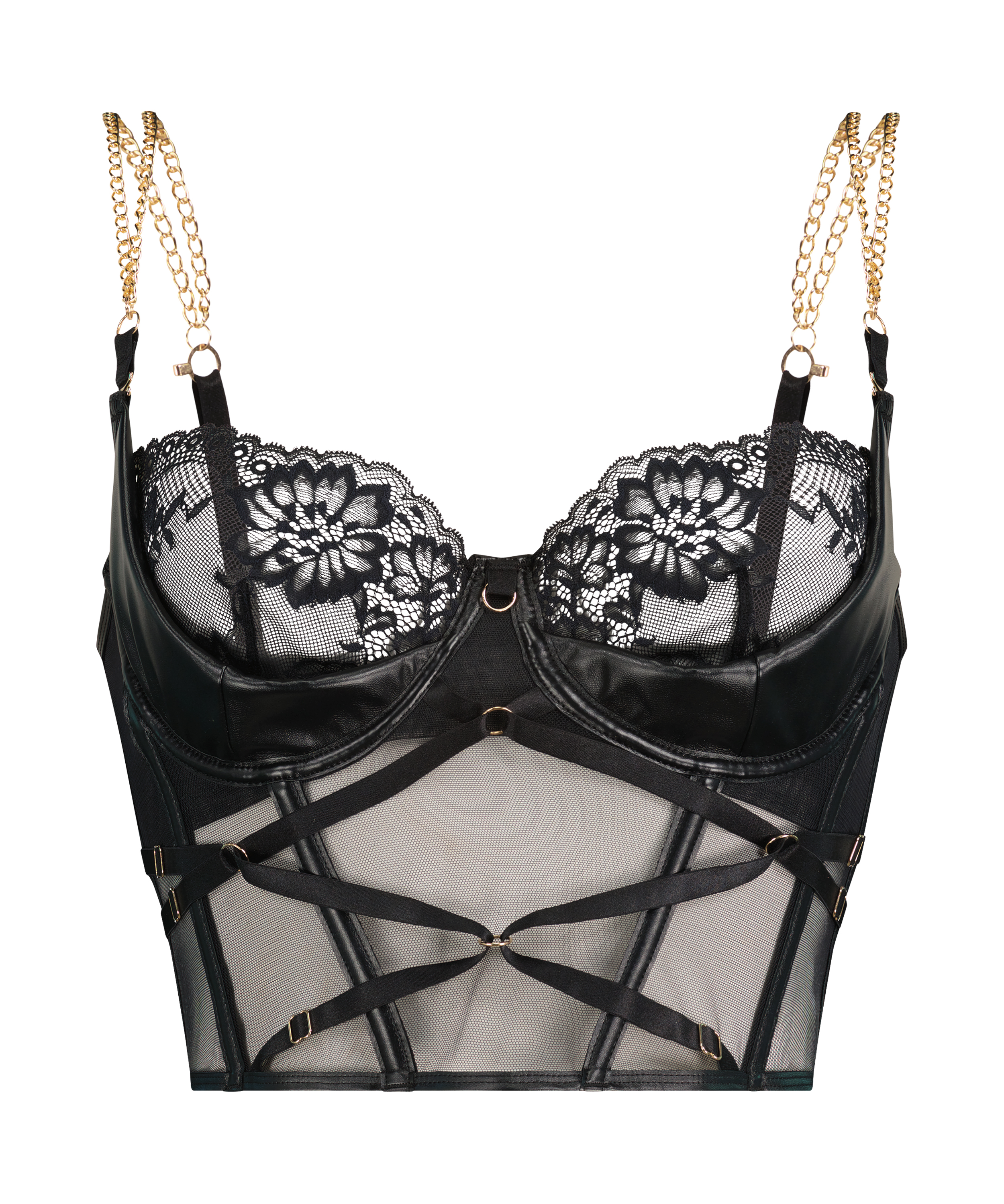 Udforsk din forførende med denne sexede bustier! Fremstillet i gennemsigtigt fiskenetmateriale, dekoreret med masser af blonder og stropper. Skålene med bøjler er lavet af et imiteret lædermateriale. Bustieren er dekoreret med en dejlig guldkæde og har for-, side- og bagudbening for at gøre den mere behagelig at have på. Match med Hecate-strengen for at fuldende sættet!