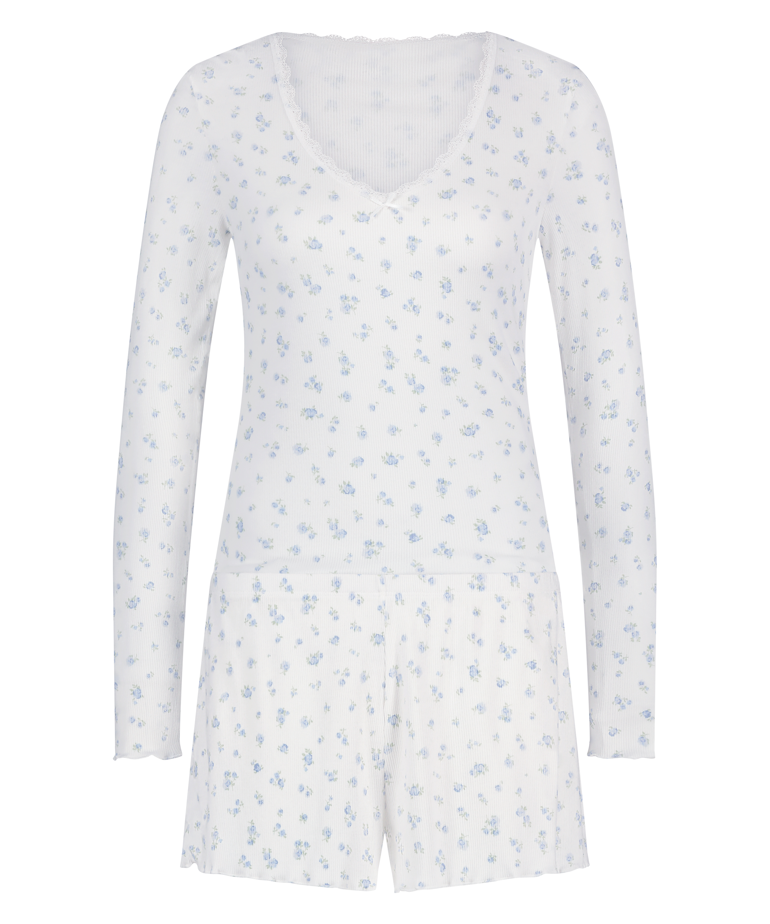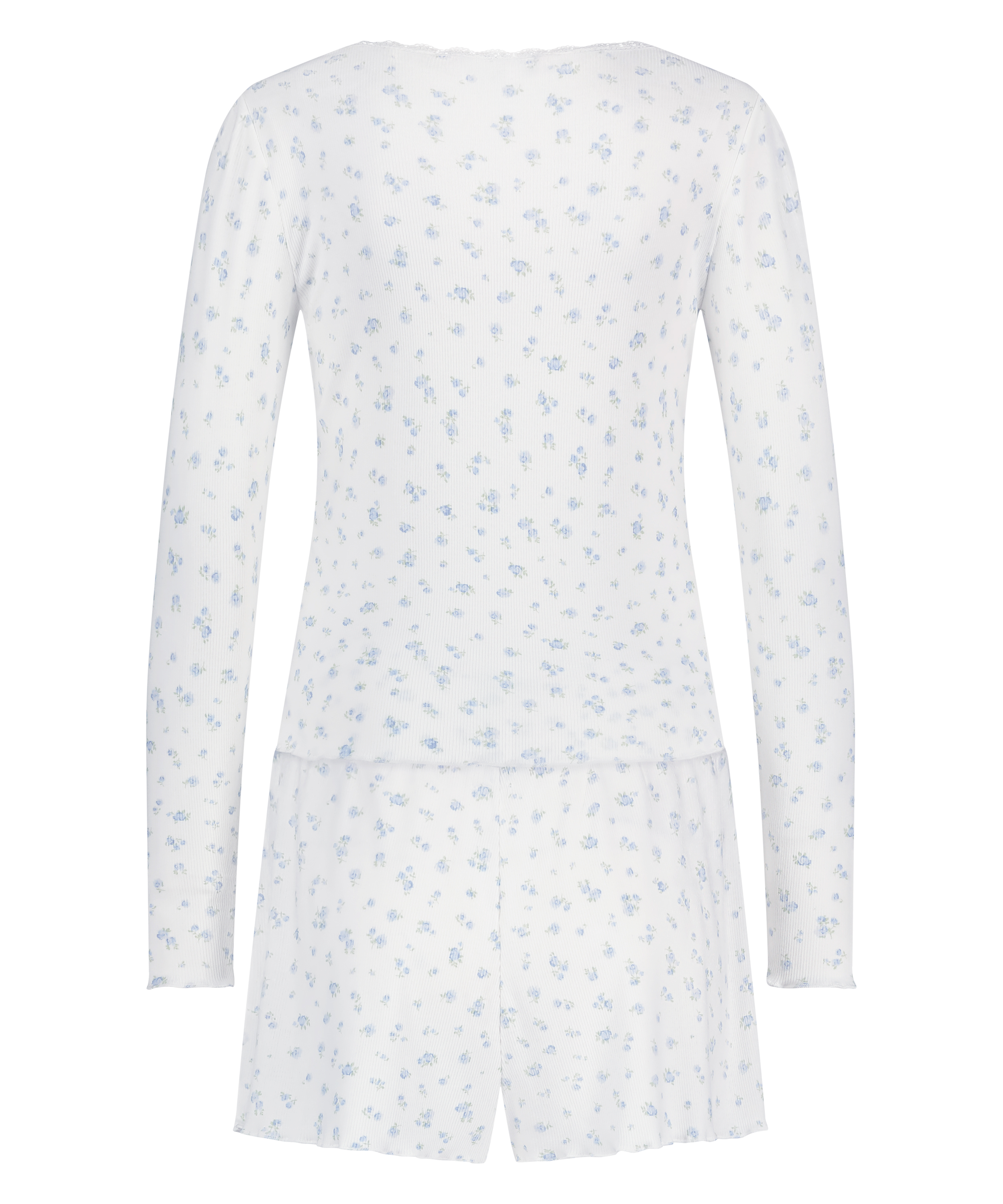 Slap godt af i vores pyjamassæt, som er en perfekt kombination af komfort og charme. Dette todelte sæt består af en blød langærmet top i rib og matchende shorts. Toppen har blondedetaljer langs halsudskæringen, hvilket tilføjer et feminint touch til et hyggeligt design. Dette pyjamassæt er ideelt til at slappe af eller sove i.