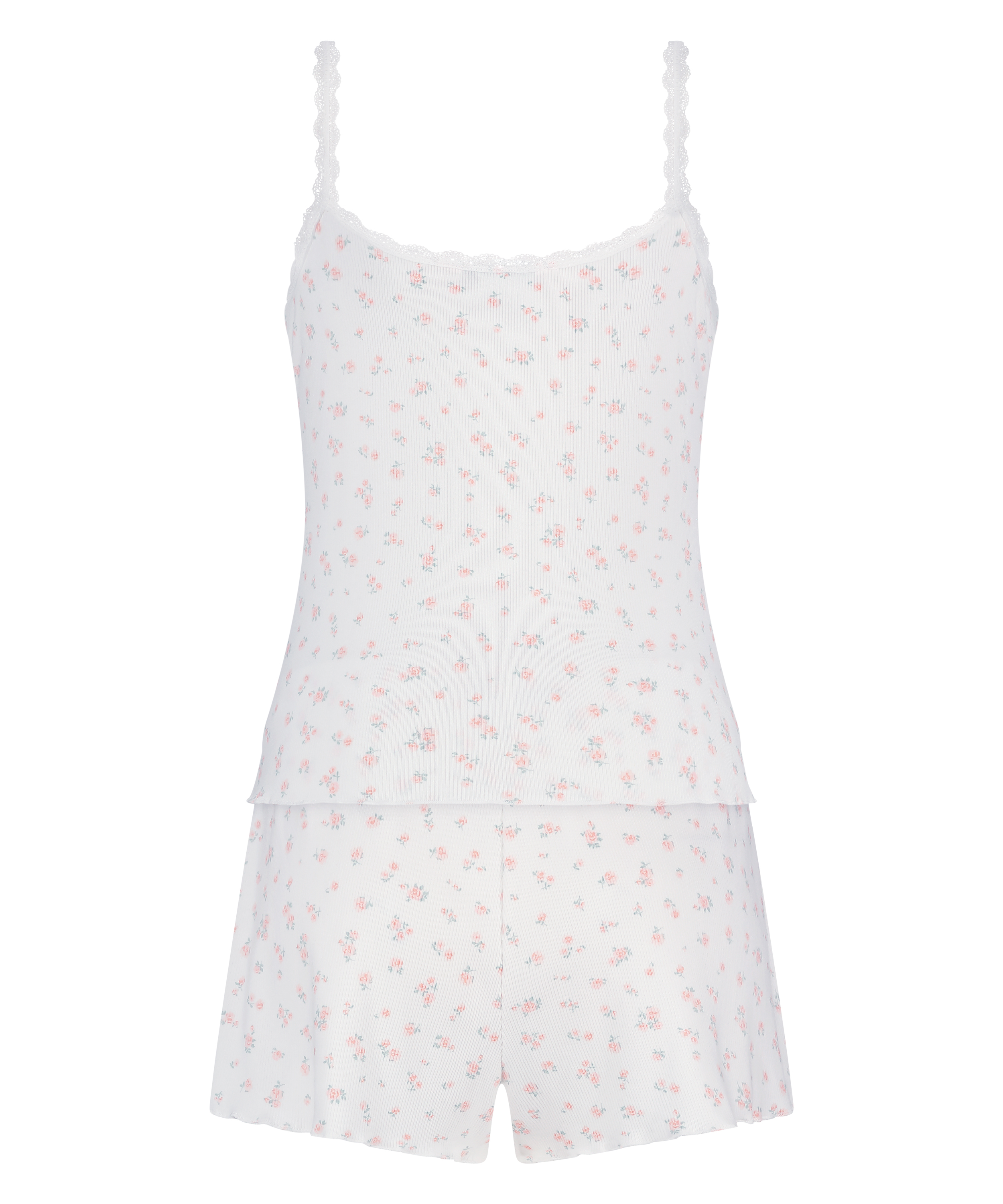Opgrader dit nattøj med vores pyjamassæt. Dette todelte sæt består af en blød, ribbet top og matchende shorts, der er designet til en afslappet og behagelig pasform. Toppen har blondedetaljer langs halsudskæringen, hvilket giver det hyggelige design et feminint touch.