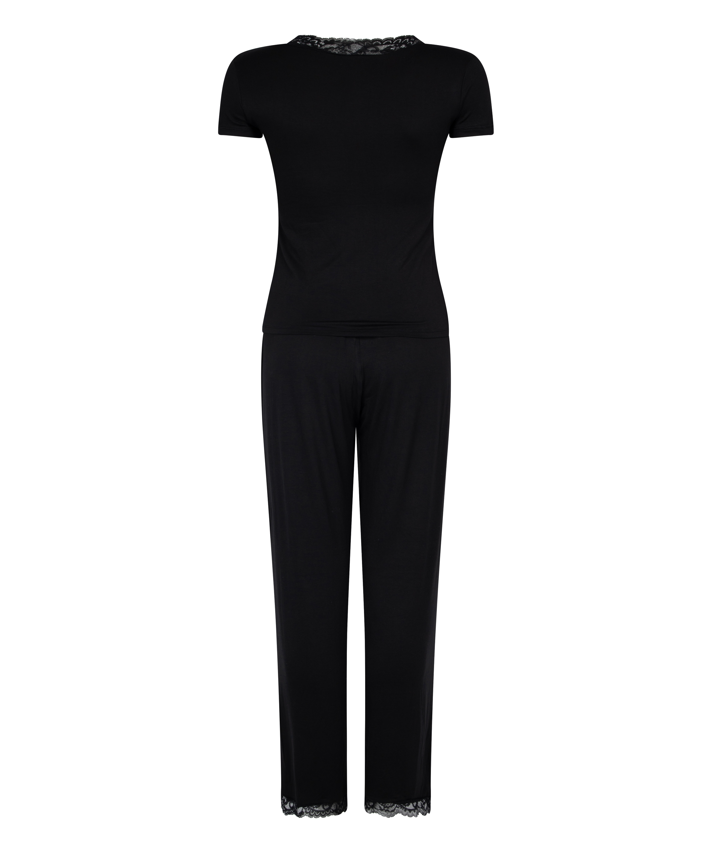 Slap af med stil med vores pyjamassæt, designet til ultimativ komfort og elegance. Dette todelte sæt består af en blød, åndbar top med korte ærmer og en flatterende V-udskæring pyntet med blonder. Kombineret med lange, bløde bukser med en afslappet pasform og blondedetaljer forneden. Dette sæt er perfekt til at slappe af i eller til en rolig nats søvn.