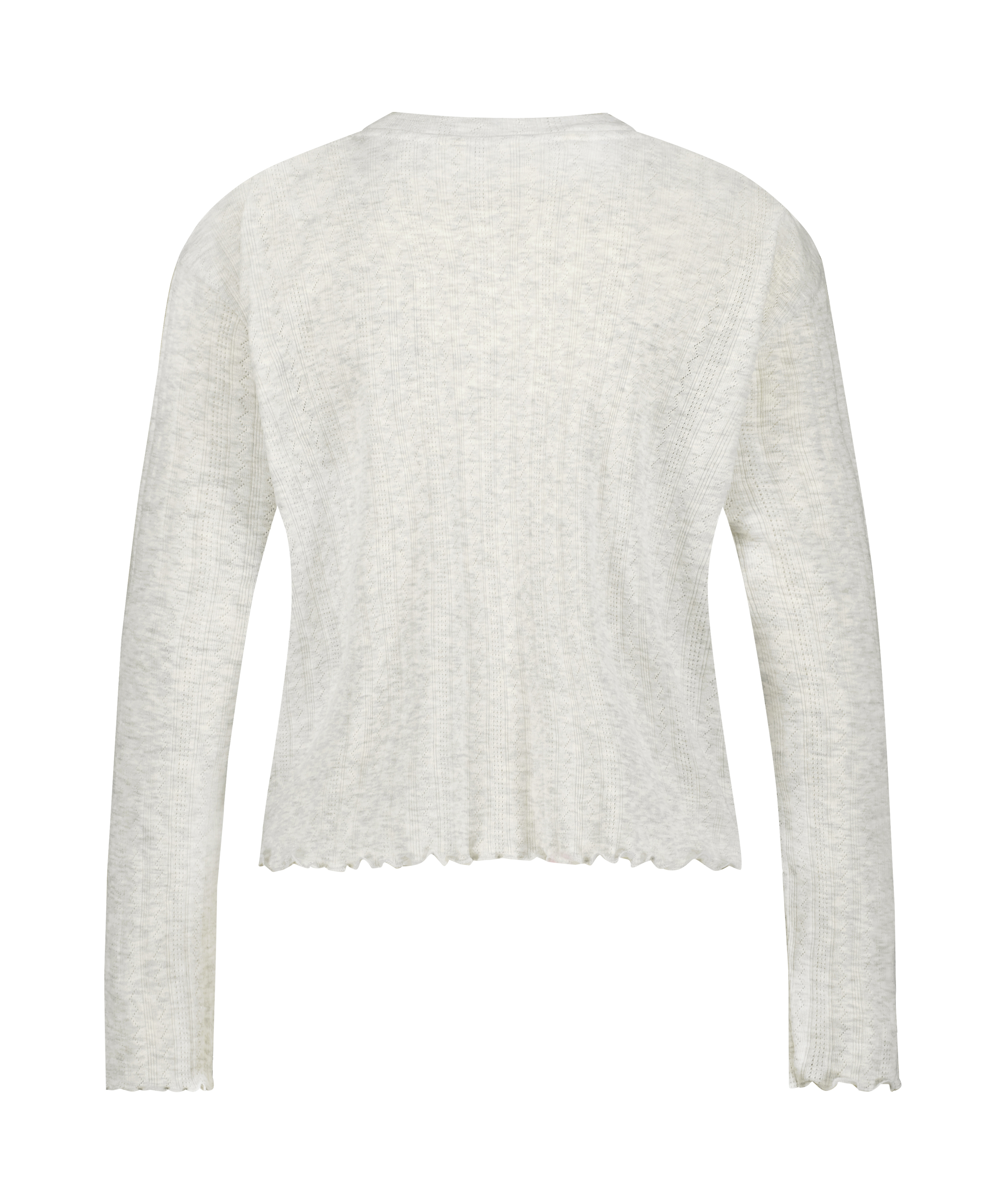 Føl dig godt tilpas i denne dejlige trøje med lange ærmer og rund hals. Den er fremstillet af det blødeste stof og har et skønt mønster samt søde flæsekanter. Sæt den sammen med de matchende bukser for at få det perfekte komfortable sæt.