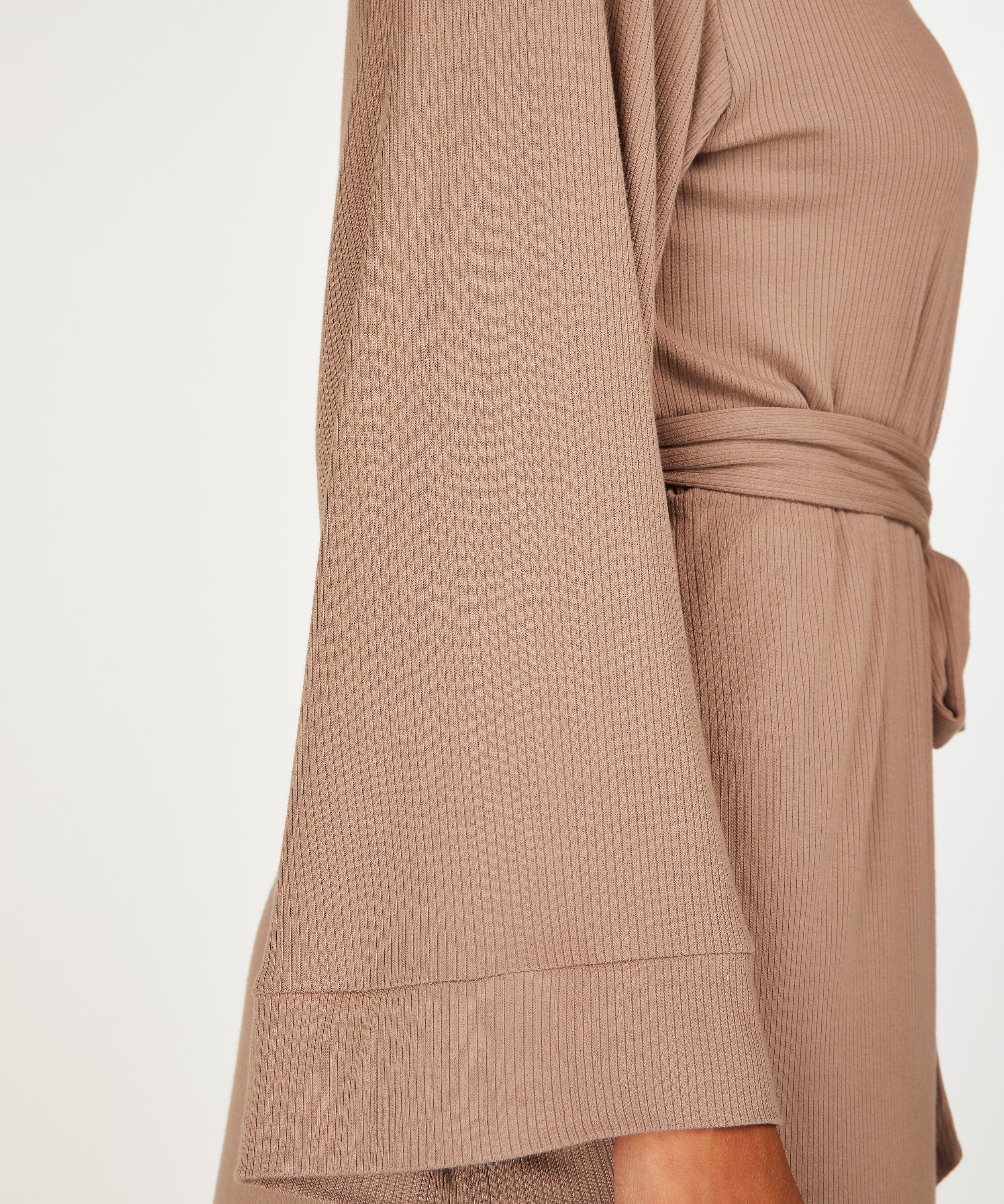Vælg et komfortabelt look med denne fantastiske kimono! Den er lavet af et elastisk ribstof for ekstra komfort. Kombiner den med sjove hjemmesko for et fantastisk sæt!