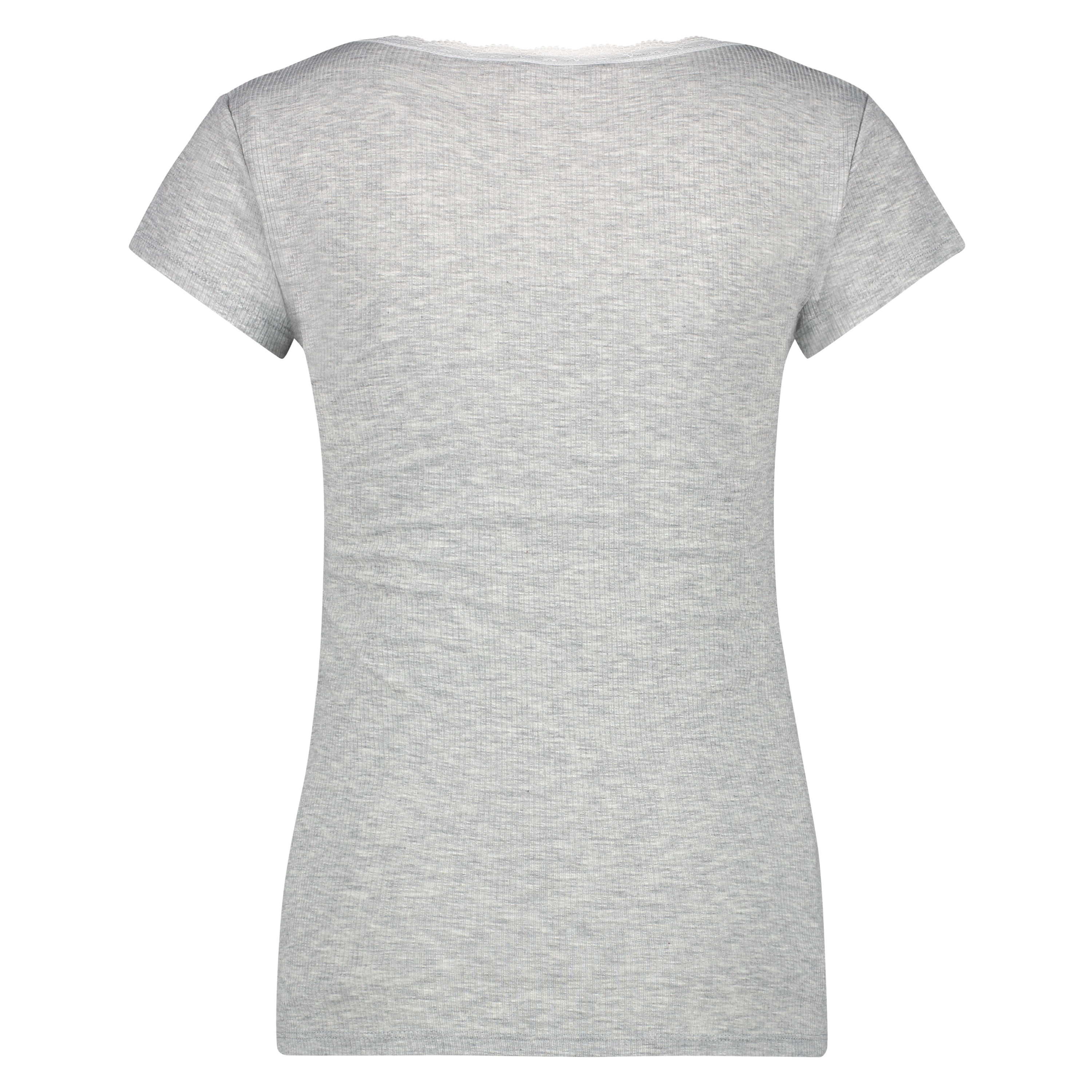 Søger du en skøn top, som sidder godt? Så er denne her til dig! Toppen med korte ærmer har ribmønster. Toppen har v-hals med blondekant.