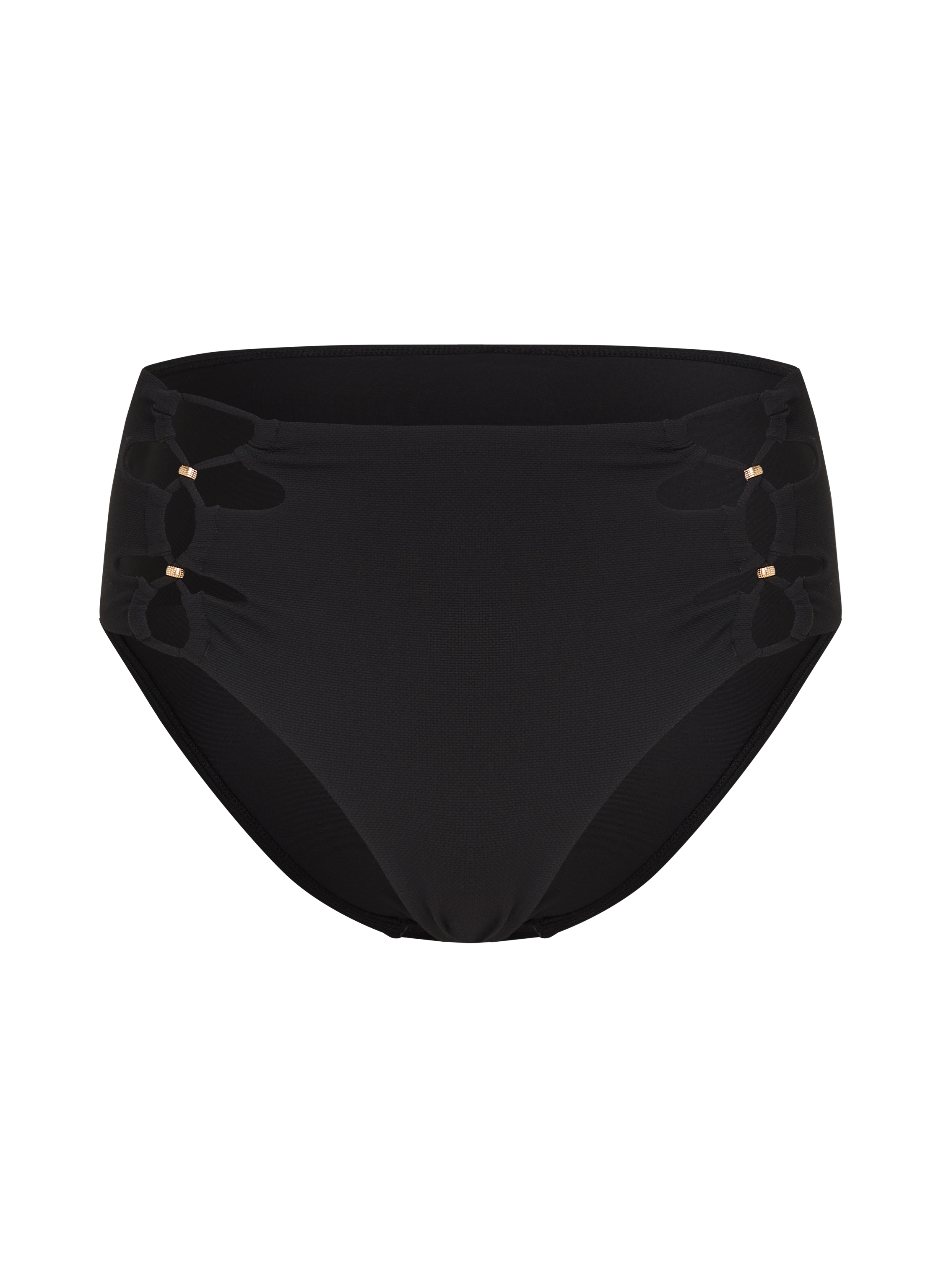 Træd ind i retro glamour med vores smukke, højtaljede bikinitrusse! Denne vintage-inspirerede trusse har en flatterende, høj taljelinje, der omfavner din figur alle de rigtige steder. Det sarte blondedesign på siderne giver den et strejf af femininitet, og den er desuden pyntet med luksuriøse, guldfarvede perler. Kombinér den med din yndlingsbikinitop for et tidløst og elegant look!