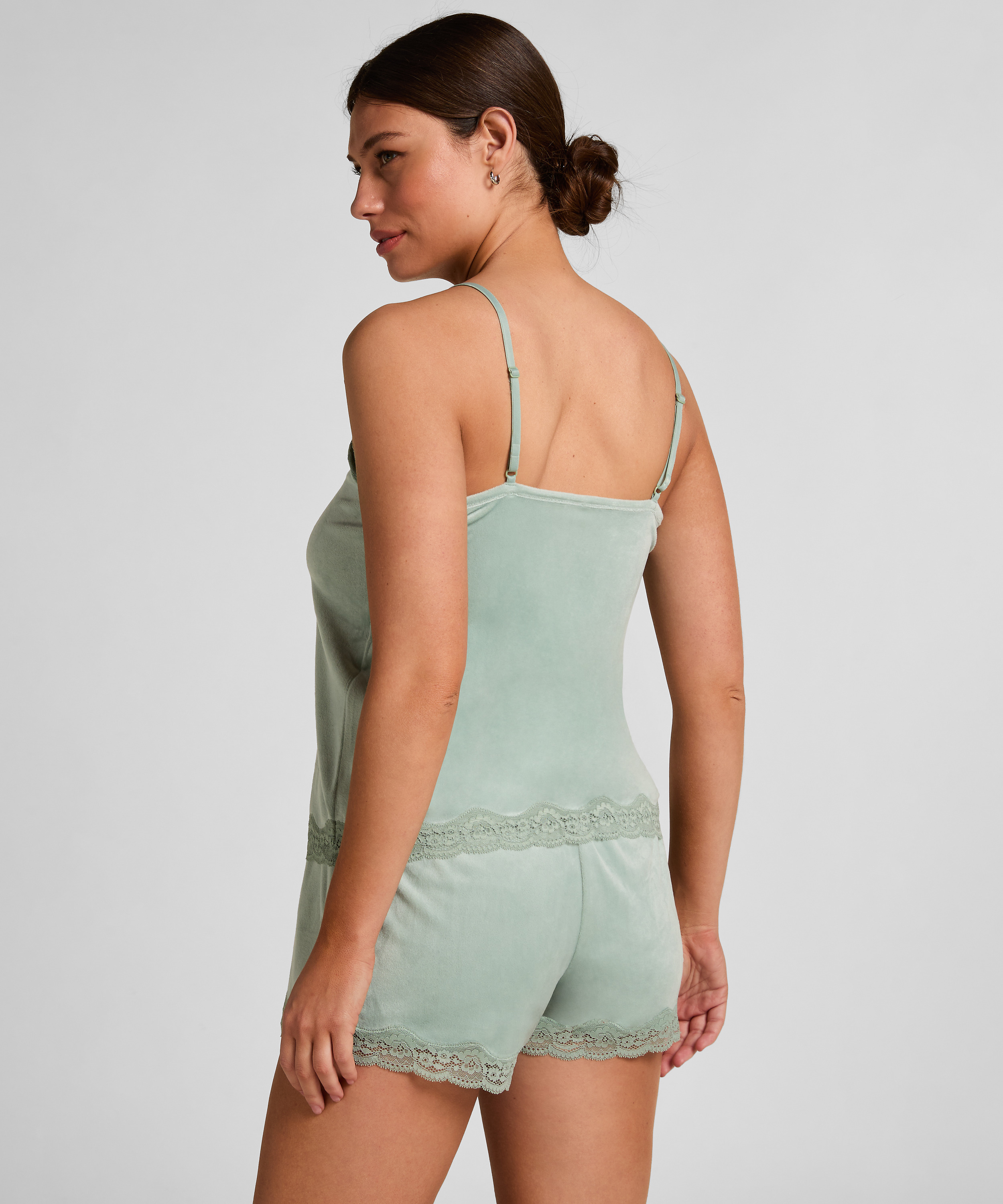 Forkæl dig selv med vores behagelige velourshorts, som er perfekt til at slappe af med stil. Disse shorts er lavet af blødt velourstof og føles lige så godt, som de ser ud. De fine blonder tilføjer et strejf af elegance og femininitet, der løfter det hyggelige look. Shortsene er designet med en elastisk linning, som giver en behagelig, fleksibel pasform, der følger kroppens bevægelser.