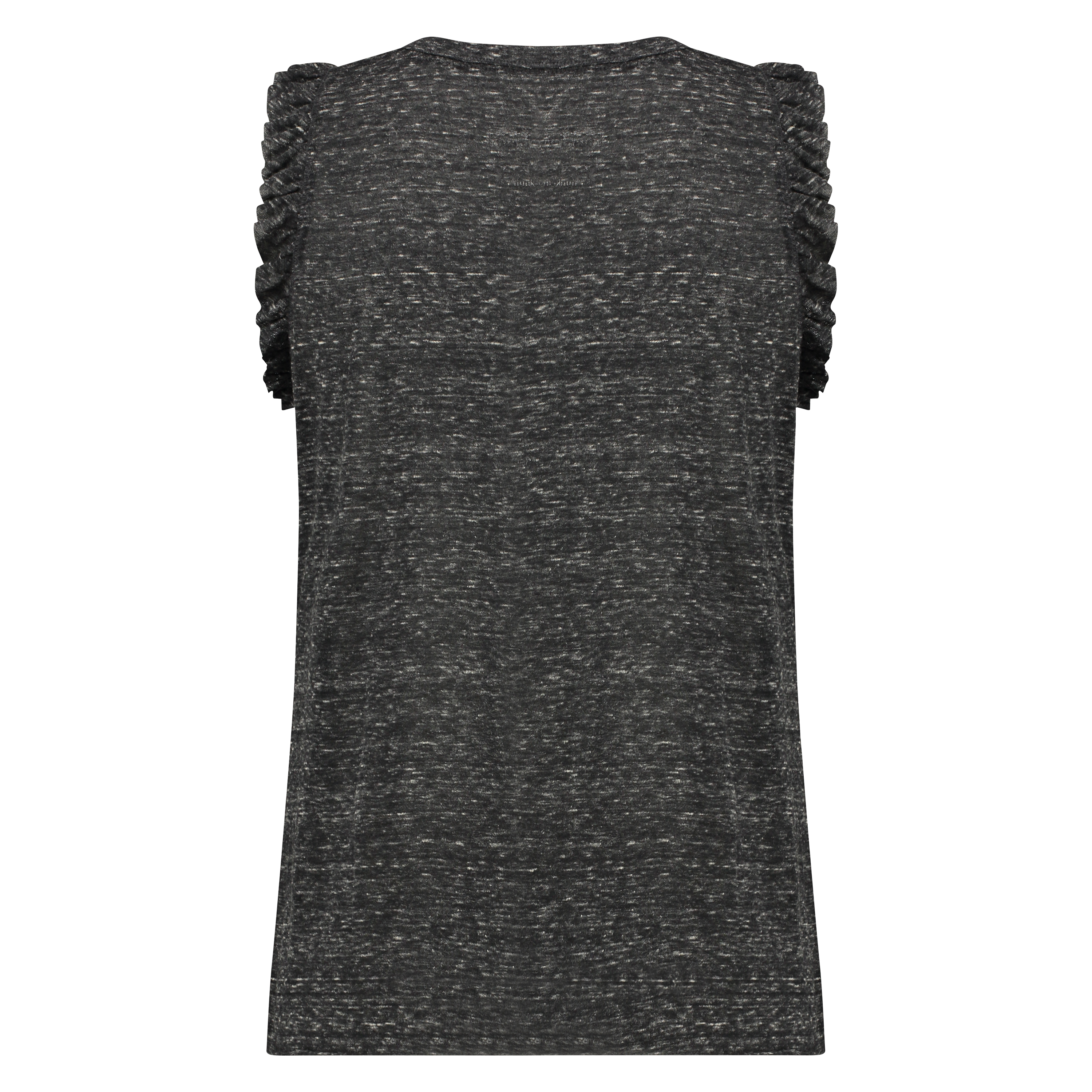 Top i et blødt og fleksibelt stof. Med rund halsudskæring. Skuldrene er dekoreret med flæser.