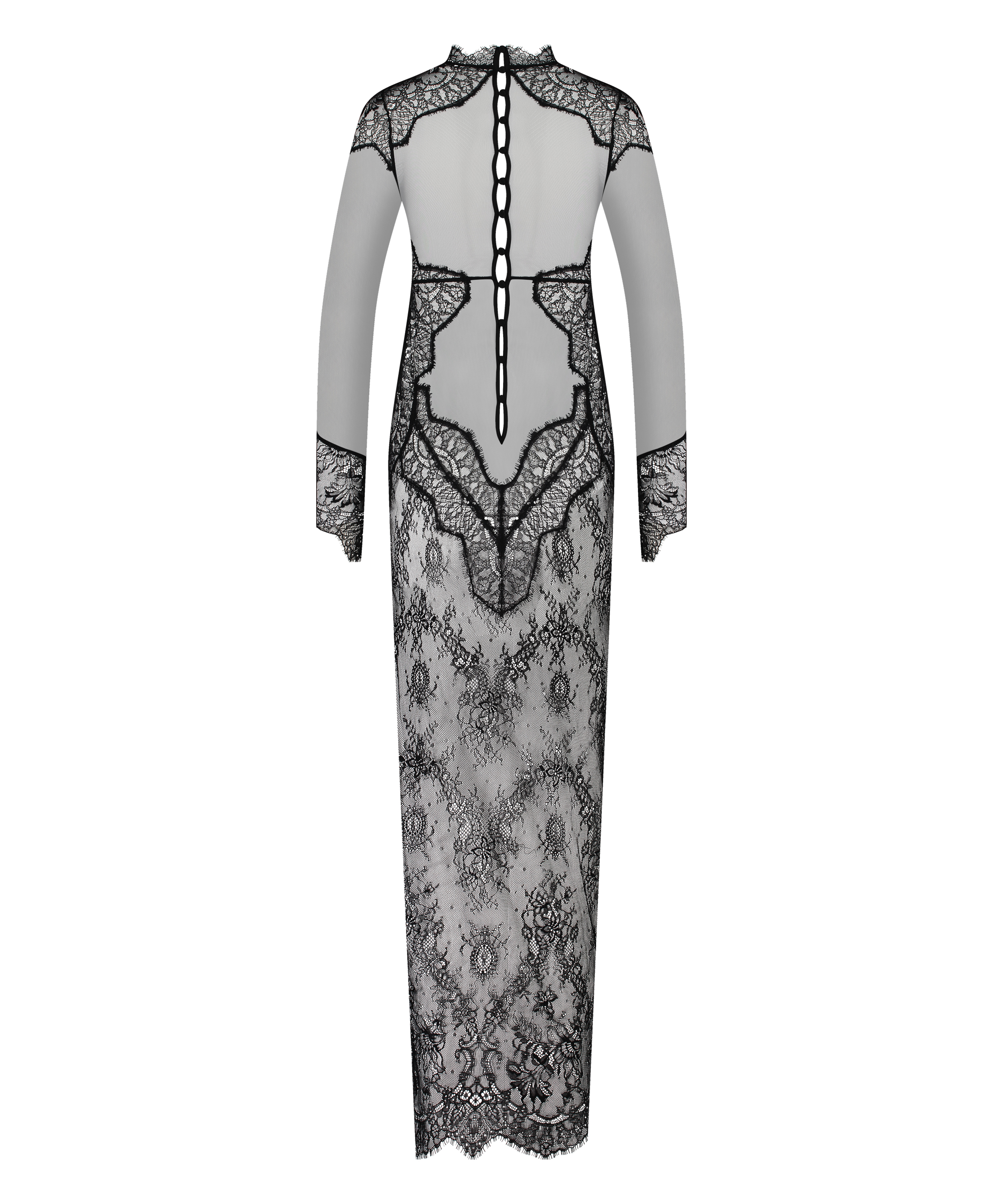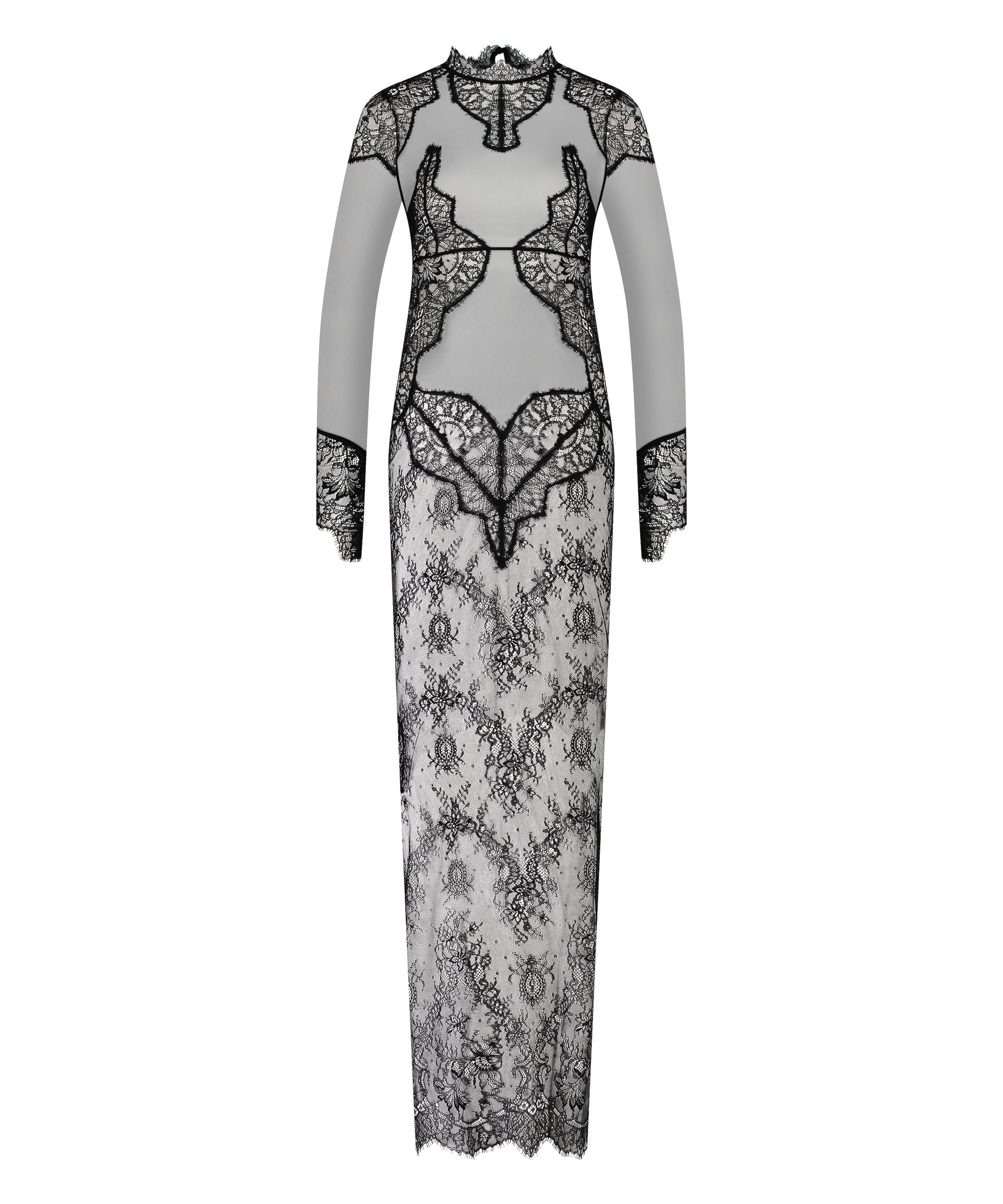 Forkæl dig selv med elegance med denne lange slipkjole! Denne fængslende del har en mesh-beklædt top med smukke blondedetaljer, som suppleres med en flirtende sideslids og en elegant rullekrave. Den udstråler elegance og charme med de lange ærmer og knaplukningen på ryggen. Sæt den sammen med dit yndlingslingerisæt for at fuldende dit look!