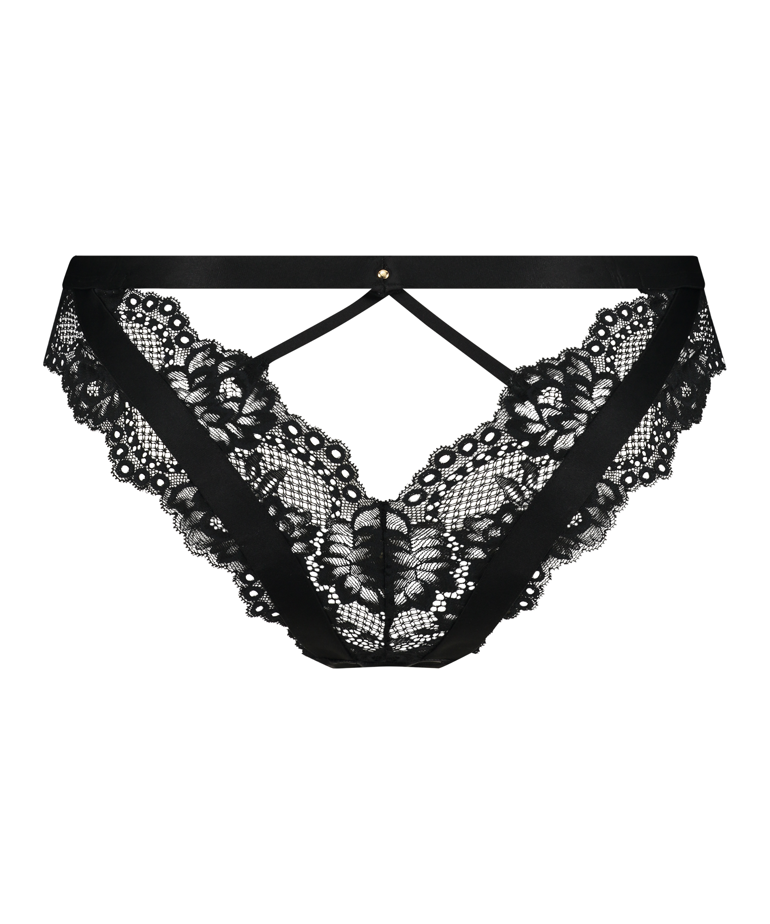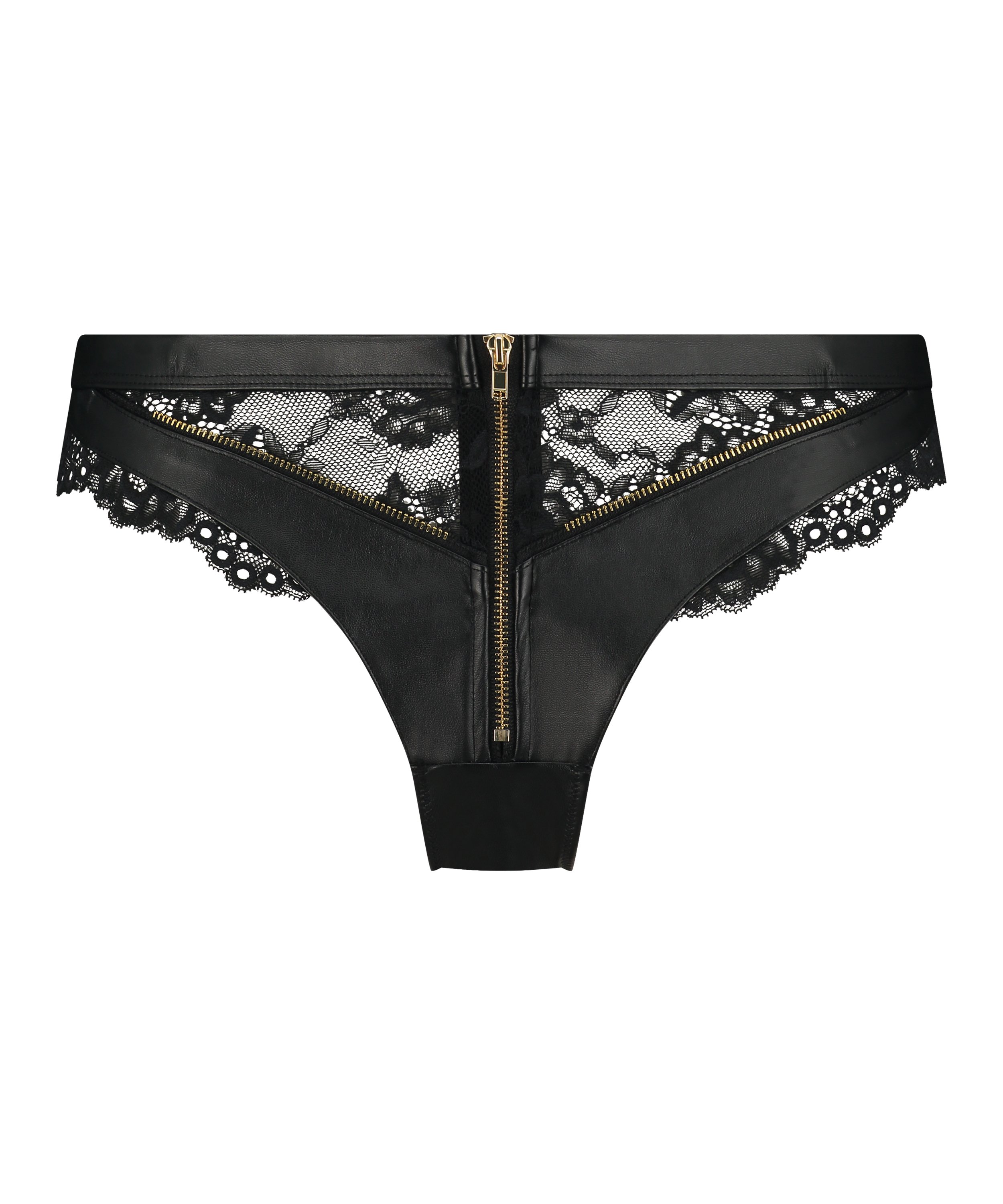 Fuldend dit forførende sæt med denne sexede brasilianske trusse. Brasilianske trusse er bundløs og har lynlås og blonder, som giver et ekstra sexet look. Den har et læder-look. En artikel fra vores Private-kollektion.
