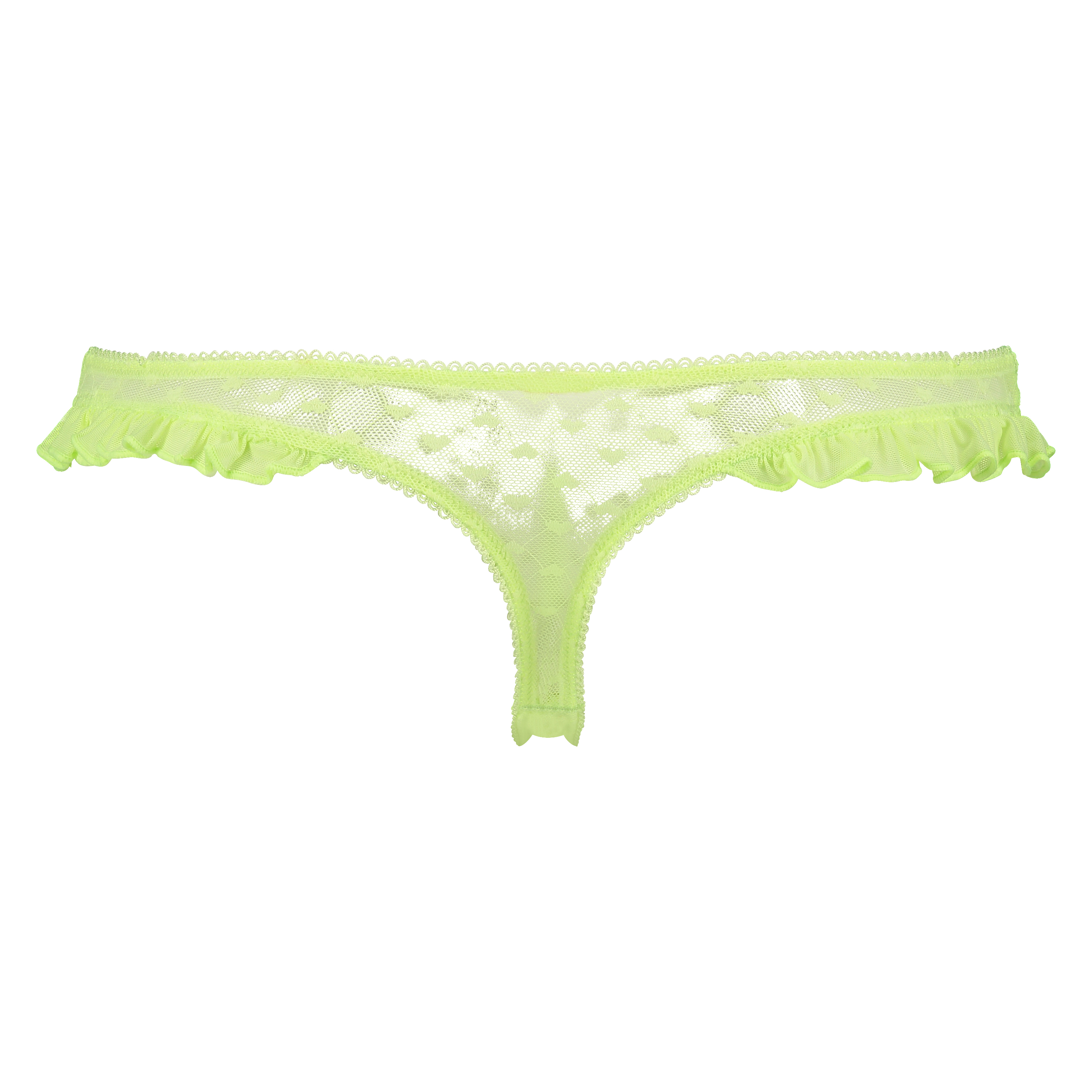 Sød g-streng i halvtransparent stof med dekorativt mønster. Med flæser i siderne og en sød sløjfe foran.