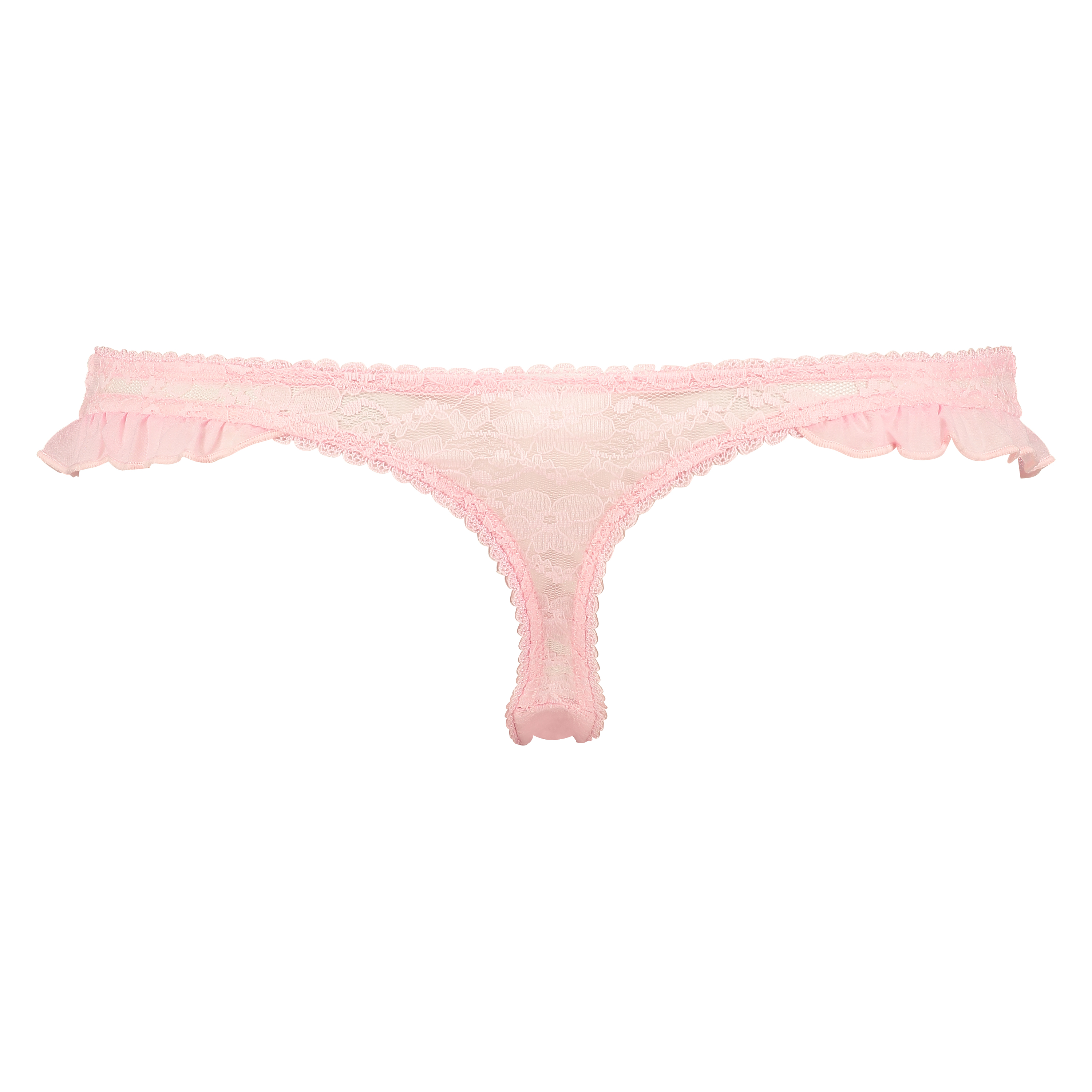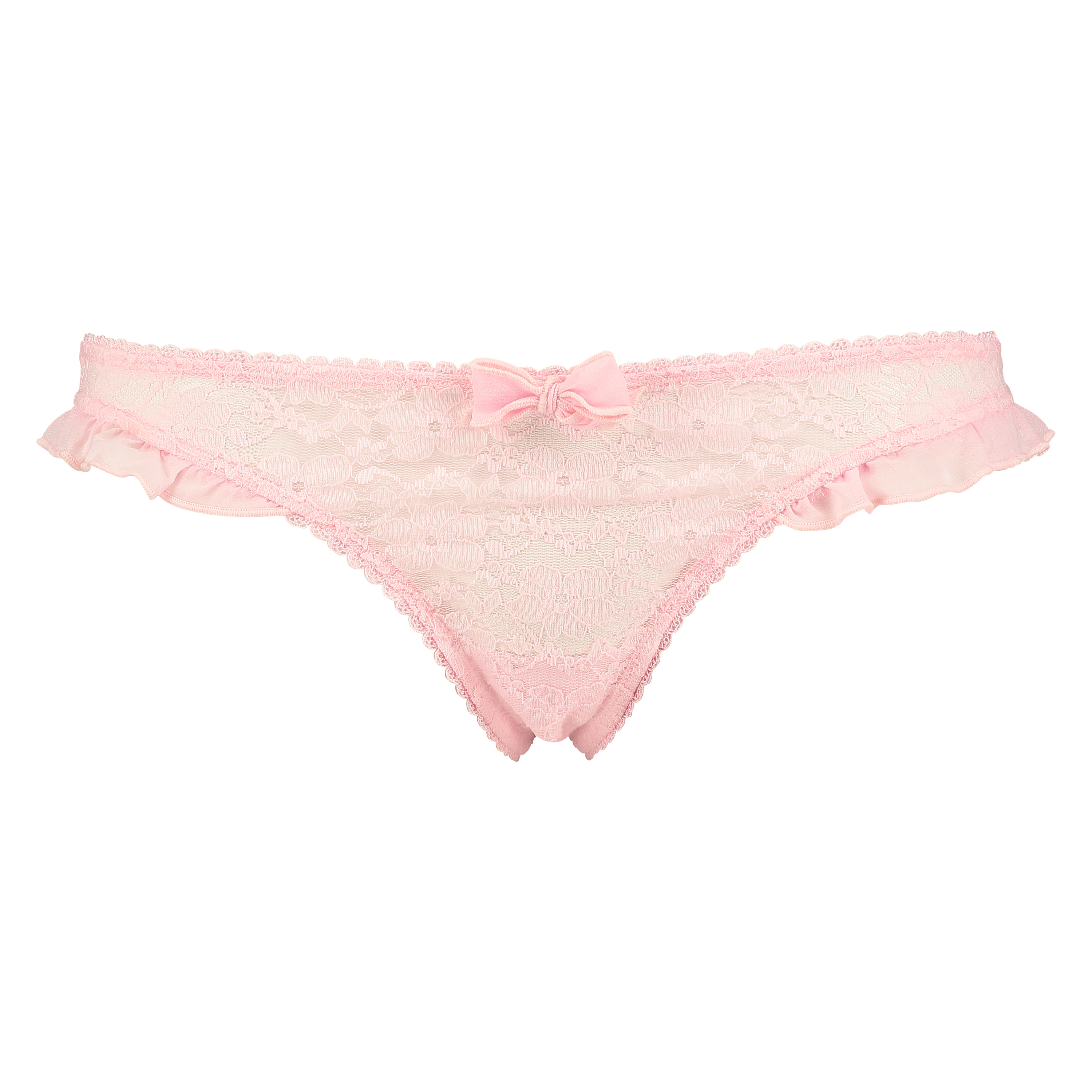 This semi-transparent thong is a soft pink colour and is finished with lace. There are two cutes bows on the hips and ruching.