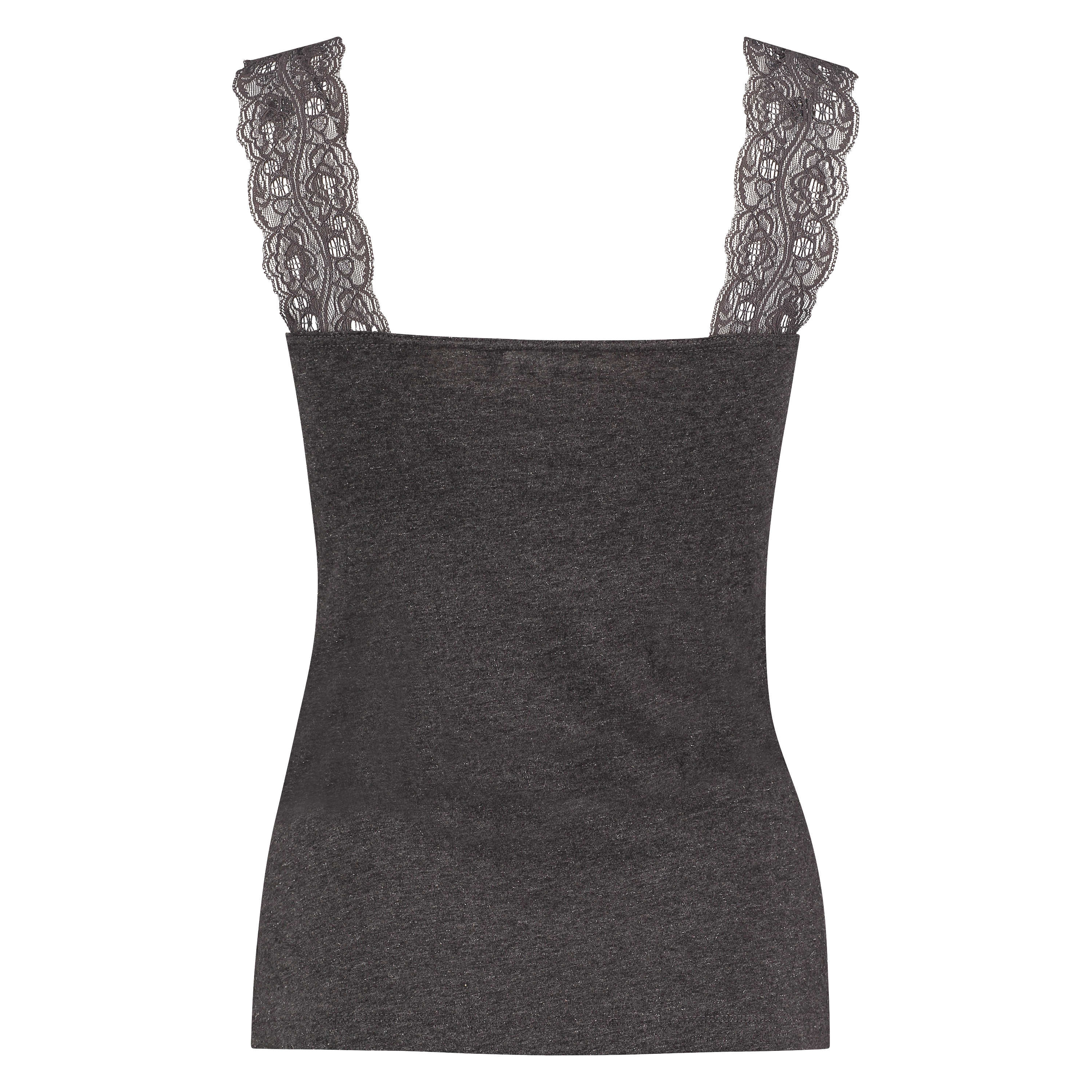 This singlet is a dark grey colour with small glitters and is finished with a lace border.