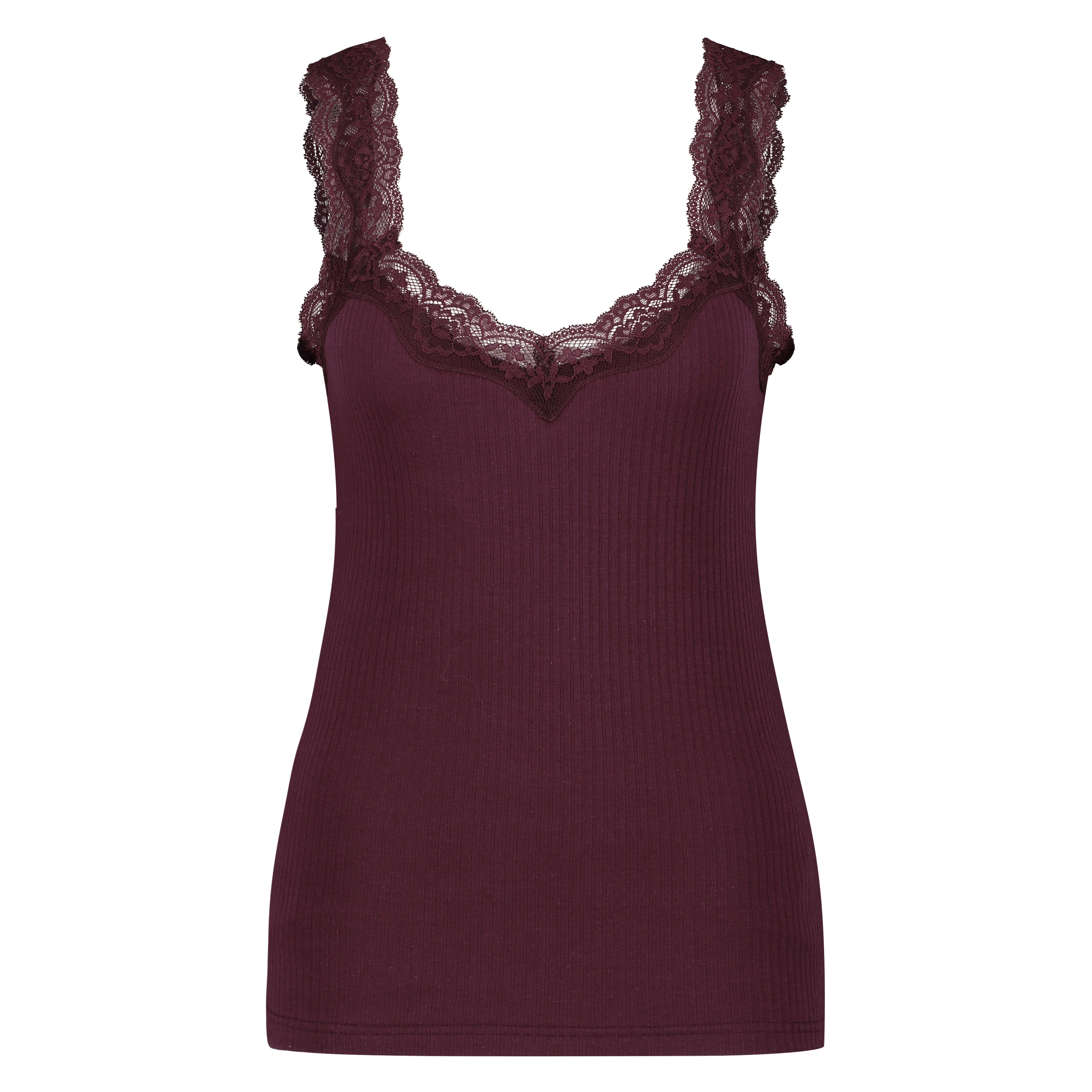 Denne cami er udført med et ribmønster. Foroven er den forsynet med blondedetaljer. Sæt den sammen med matchende items!