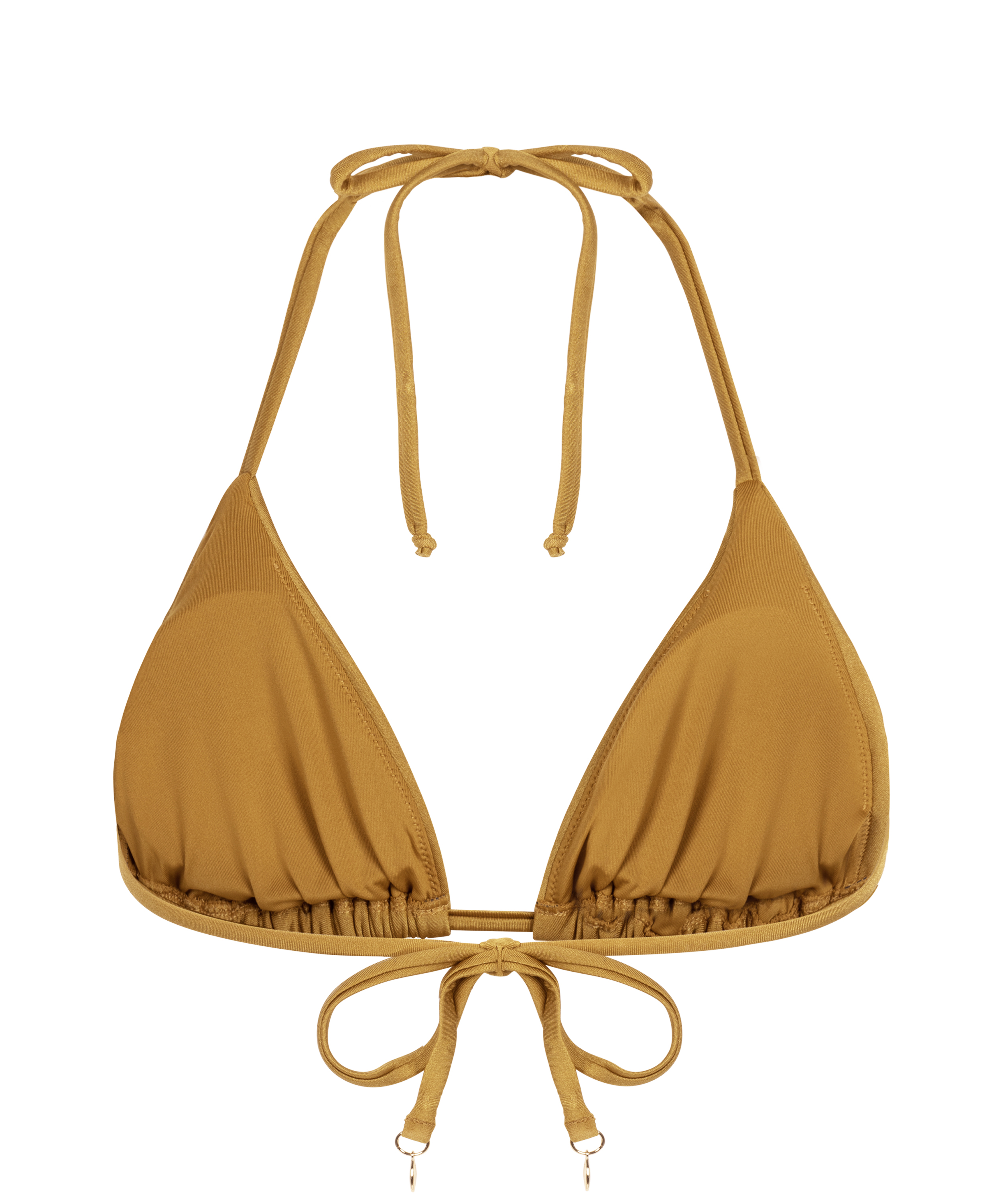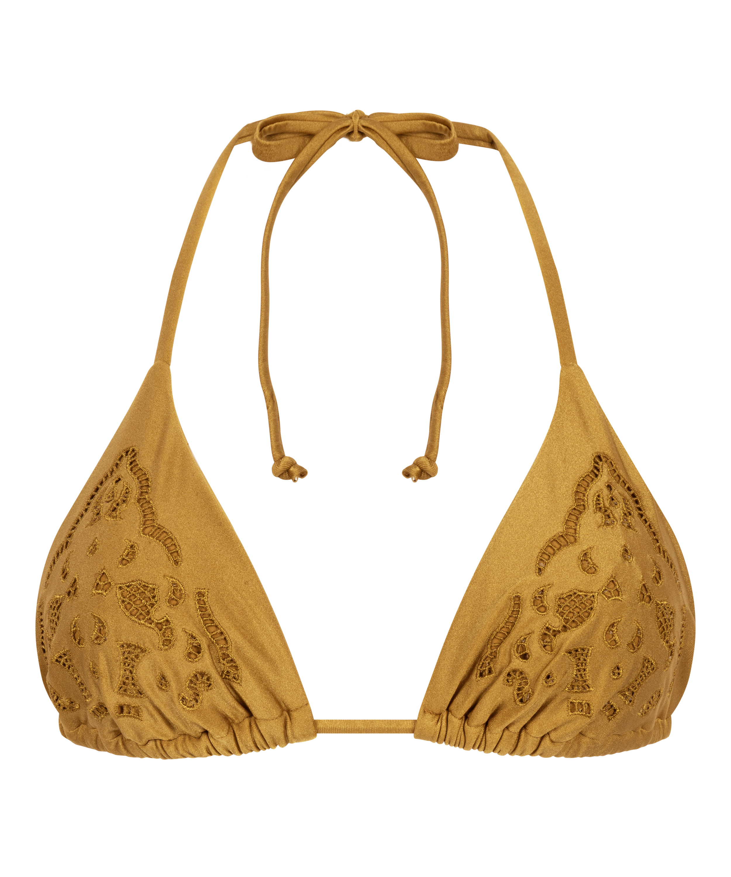 Denne trekantede bikinitop har smukke detaljer i broderi. Bikinitoppens stropper er pyntet med små dekorative skaller. Alsidige stropper giver dig mulighed for at style toppen på flere måder. Vores trekants-bikinier er fuldt justerbare med bindebånd i nakken og på ryggen, så du kan vælge den ønskede dækning. Ønsker du mere dækning, så prøv en størrelse større.