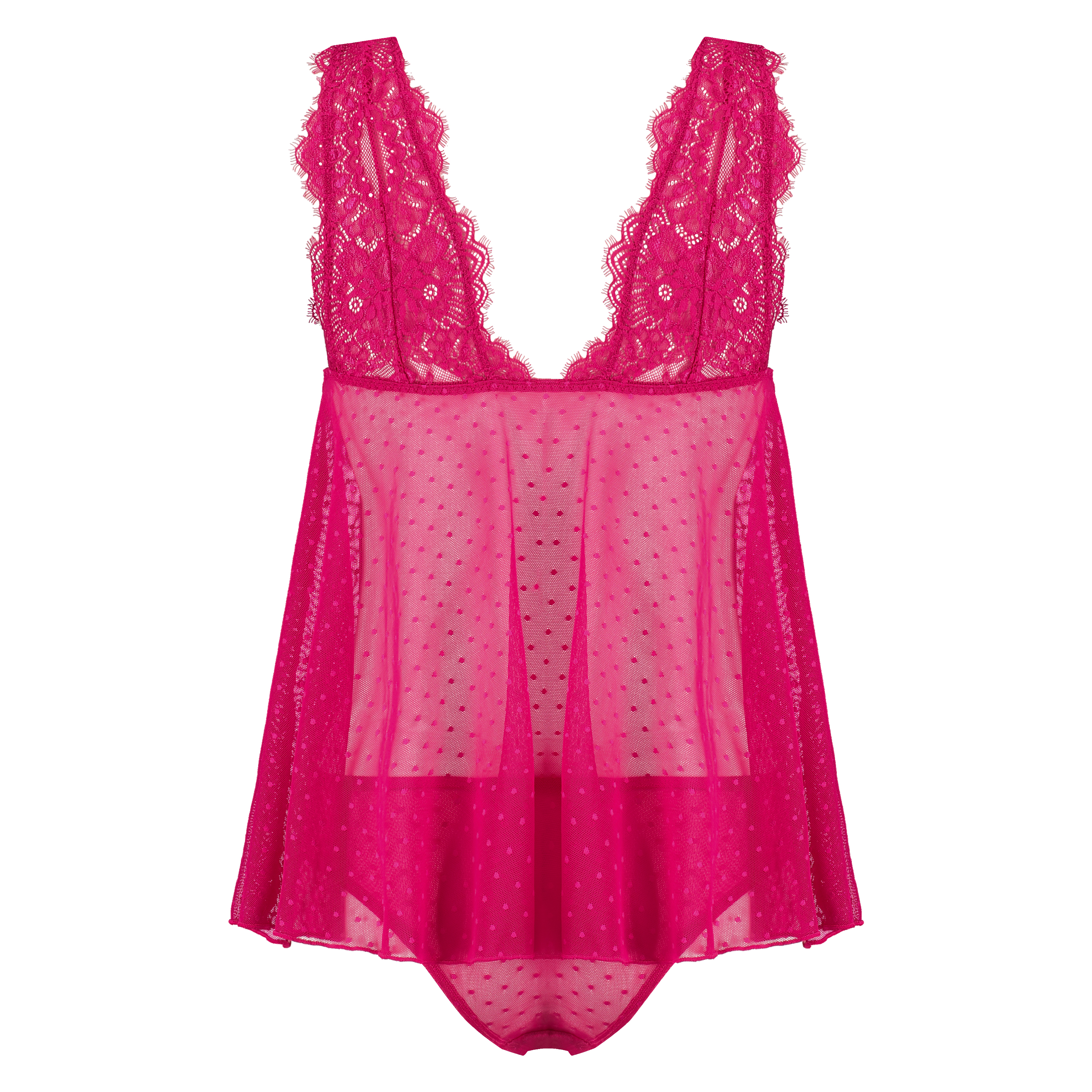 Er det ikke bare et skønt camisæt? Toppen består af mesh og blonder og er fuldendt med snøredetaljer. De matchende trusser er lavet af en blanding af blonder og mesh.