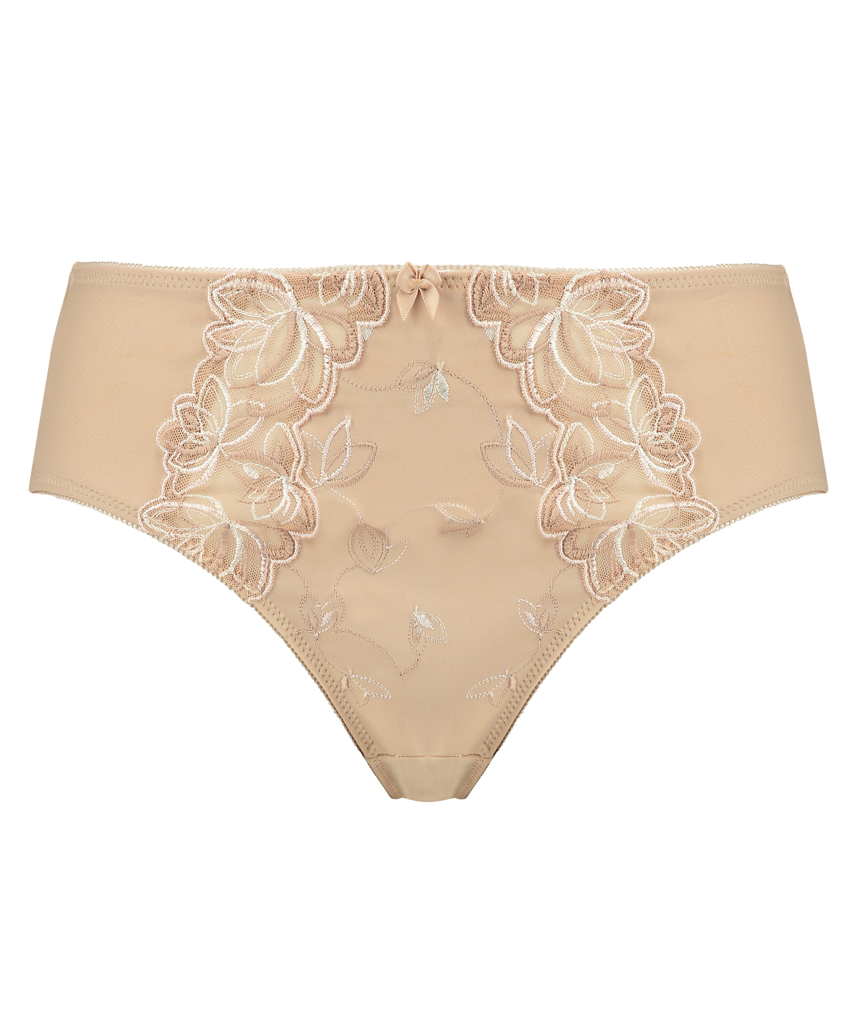 Høj trusse i et blødt og fleksibelt materiale, der giver en flot pasform. Trussen har blomsterbroderi og en lille sløjfe på forstykket.