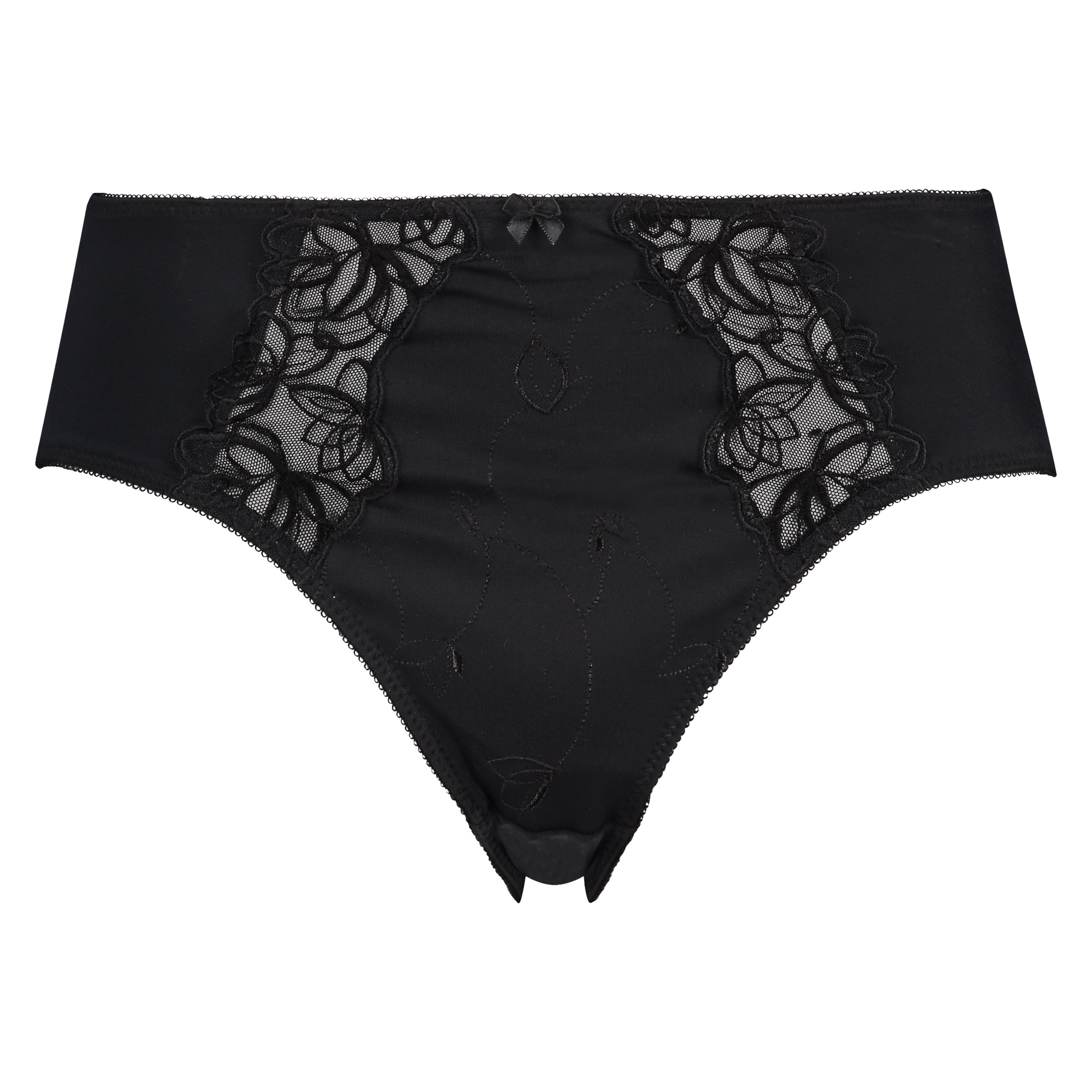 Høj trusse i et blødt og fleksibelt materiale, der giver en flot pasform. Trussen har blomsterbroderi og en lille sløjfe på forstykket.