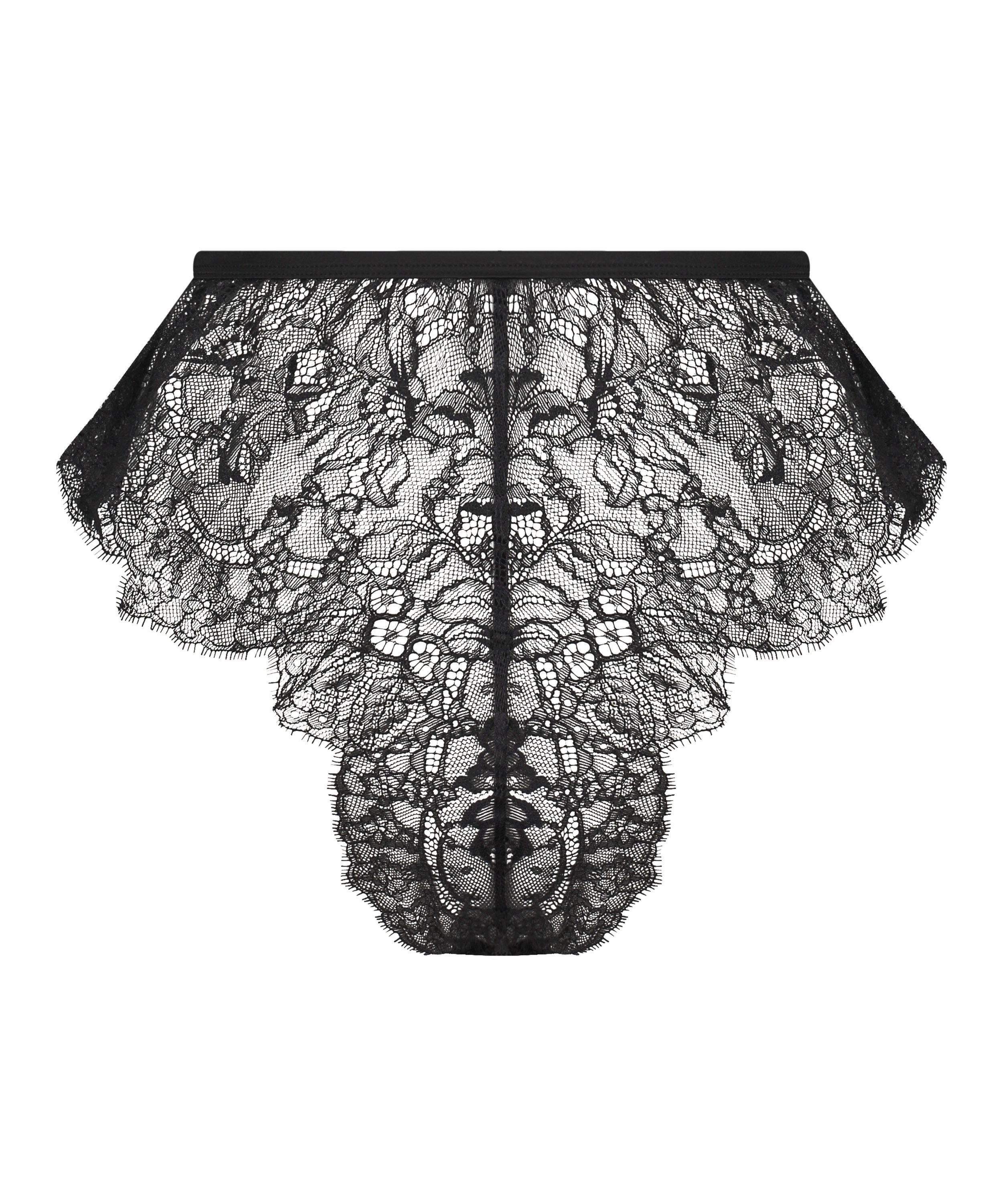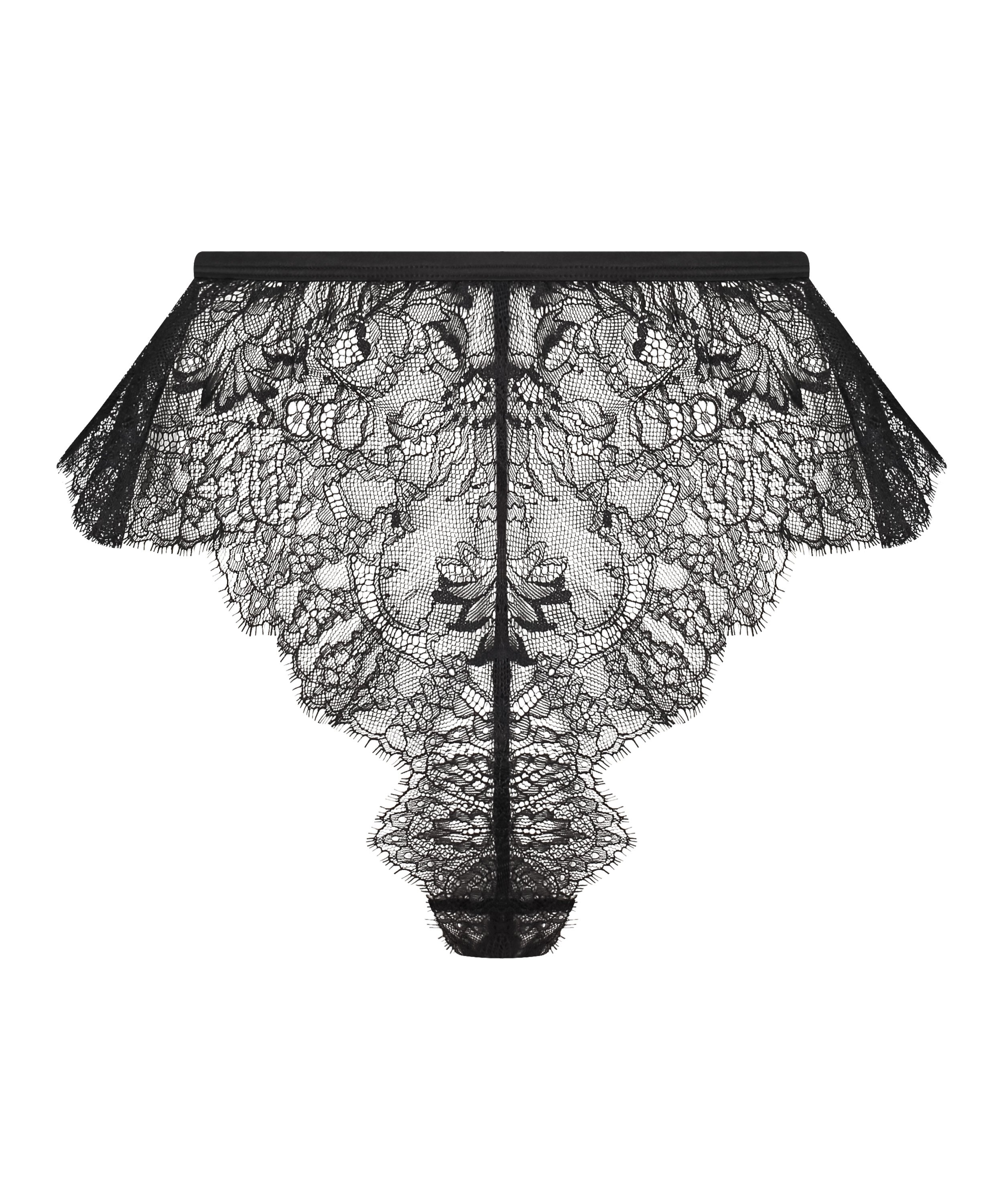 Stå ved din guddommelige kerne med denne slående trusse! Denne fortryllende trusse er fremstillet af sarte blomstrede blonder og har en delikat og flydende blondekant, der afsluttes med en subtil V-formet linning med fræk tildækning af numsen. Dette er fra Noir-kollektionen og kan nemt sættes sammen med Camille peplumtoppen i blonde med bøjler for at fuldende dit sæt med elegance og udstråling!
