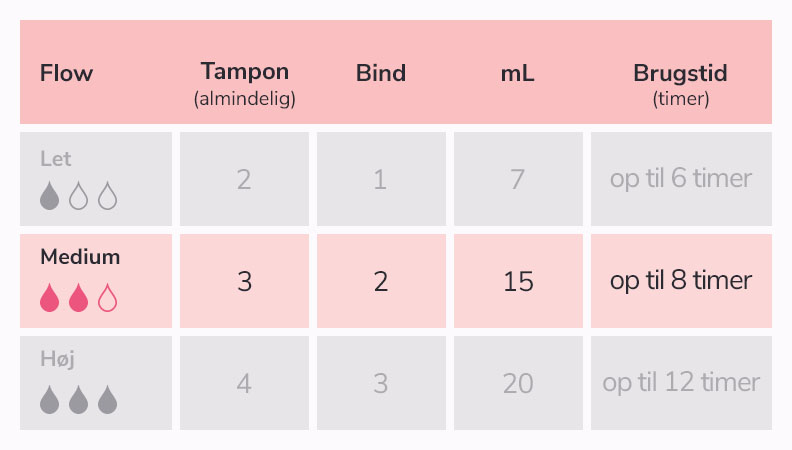 Se vores tabel, for at finde ud af hvilken absorberingsevne der passer bedst til dig, uanset om du har en let, medium eller kraftig menstruation.