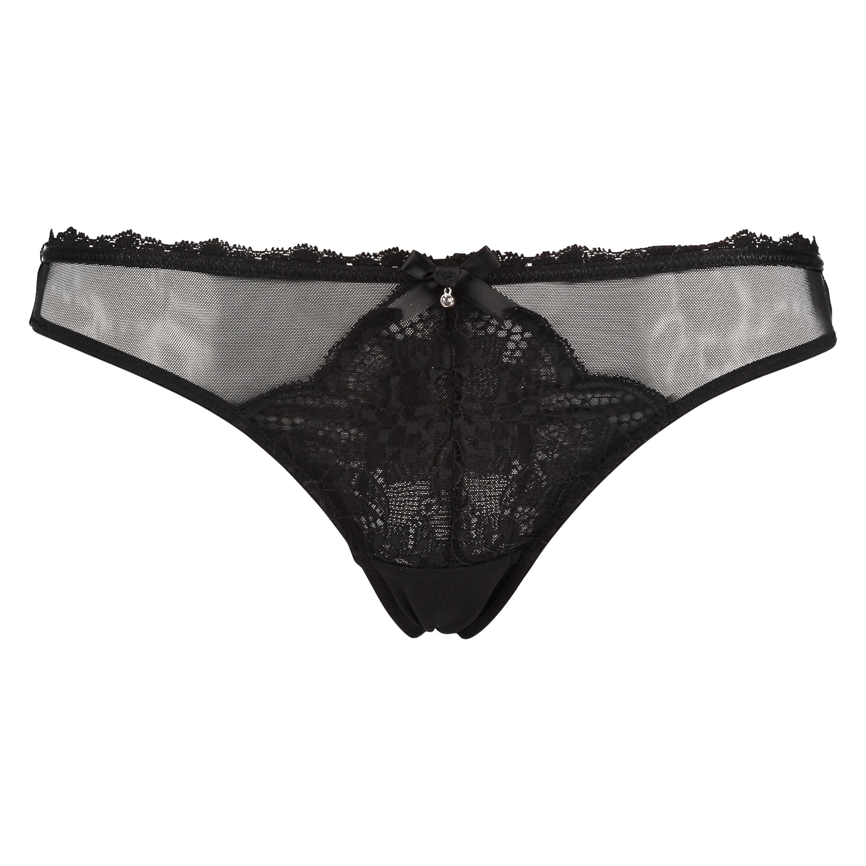 Sexet g-streng med forstykke i halvtransparent stof med blondemønster. Med en lille sløjfe og en glitrende sten foran.