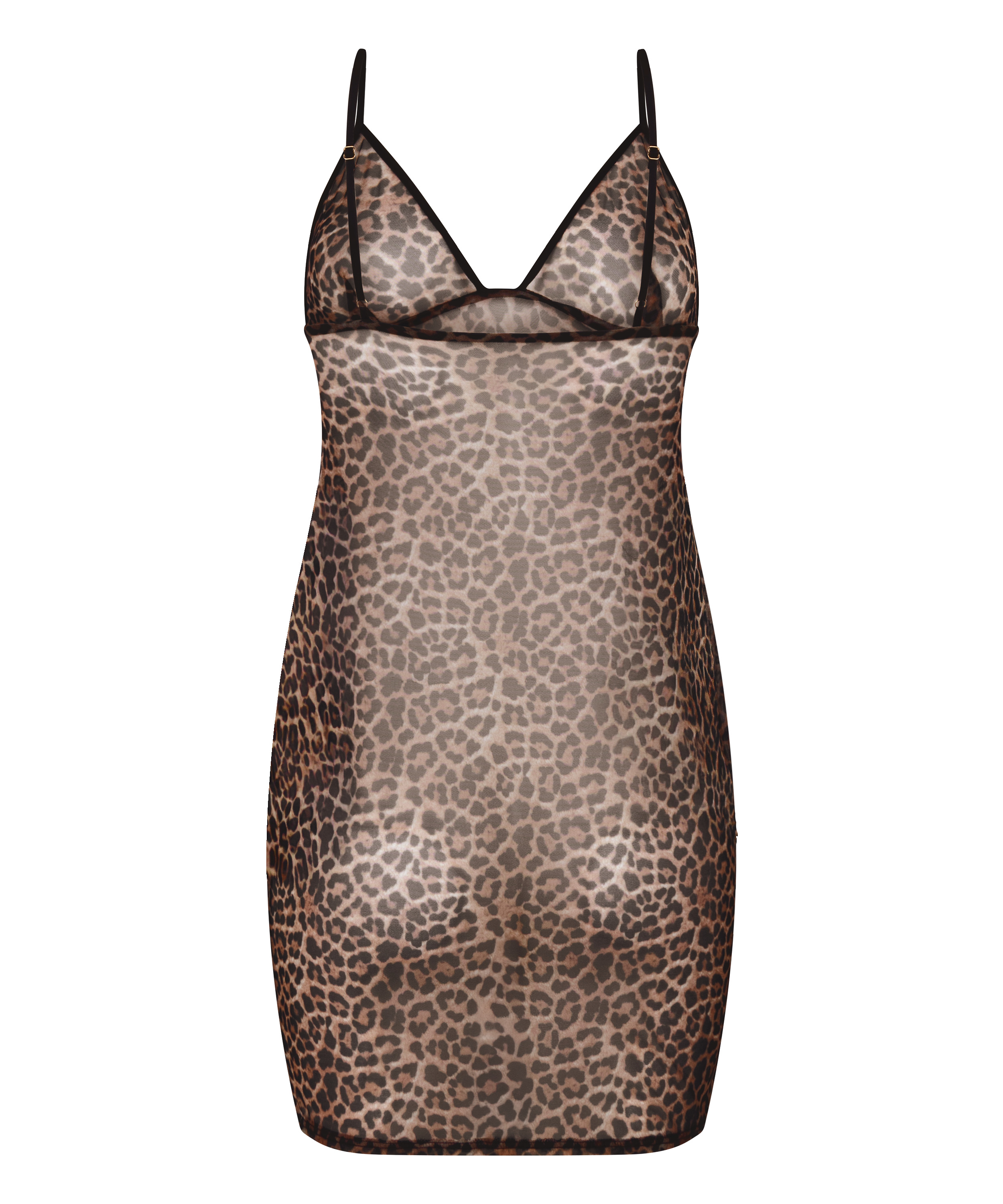 Skru op for varmen i denne gennemsigtige underkjole i mesh, der er designet til at omfavne og fremhæve din silhuet. Delikate stropper og en flydende pasform skaber et ubesværet sensuelt look. Style den med matchende dele for en forførende aftenstil, der efterlader et varigt indtryk.