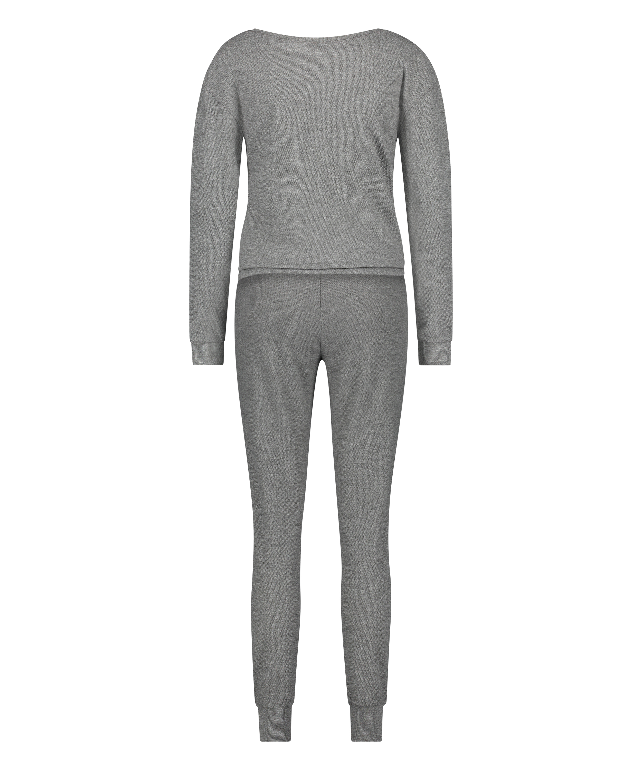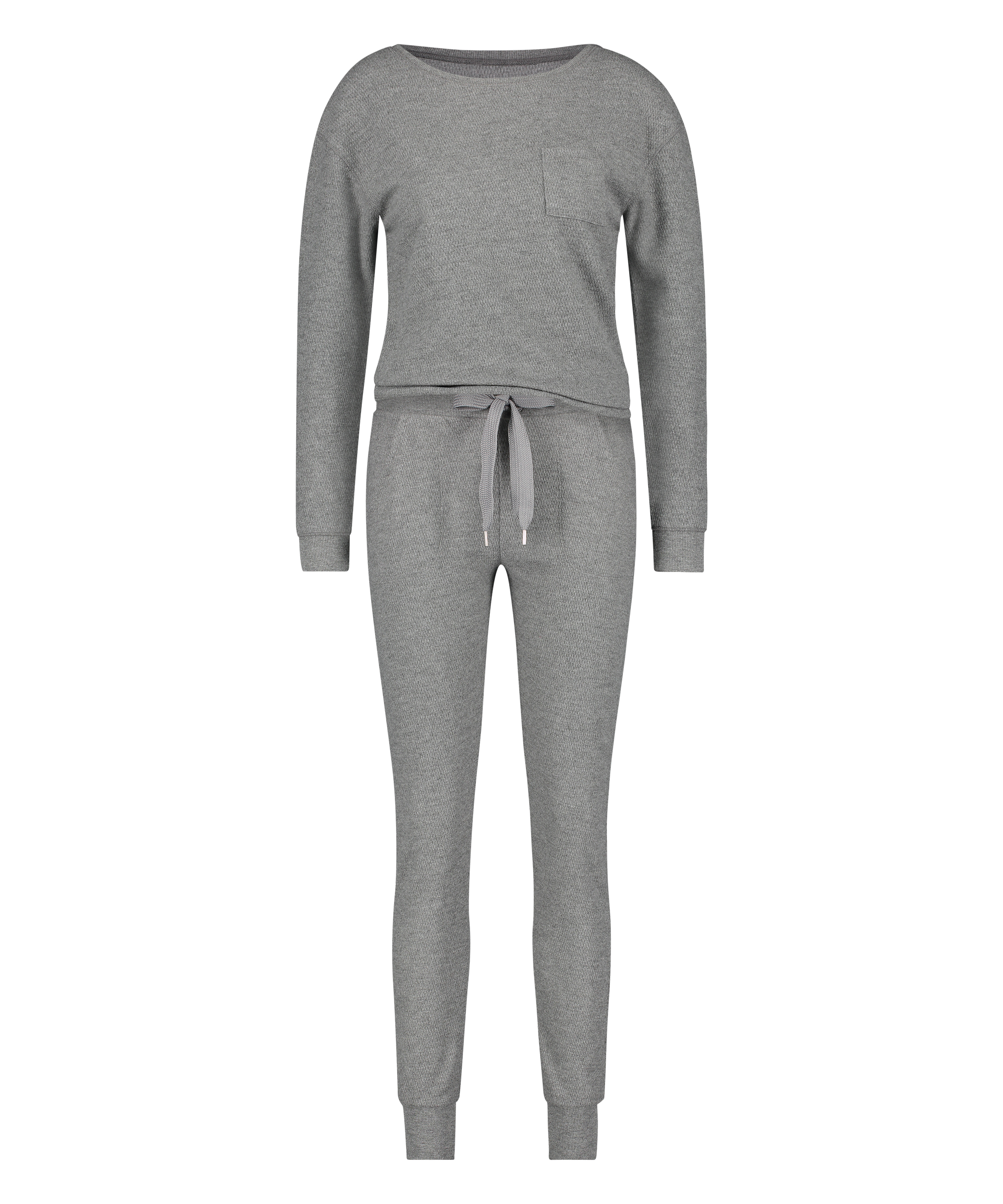 Pyjamas bestående af top og bukser. Toppen har lange ærmer med elastikker i ærmegabene samt rund hals. Bukserne har elastik i taljen samt elastik i benåbningerne.